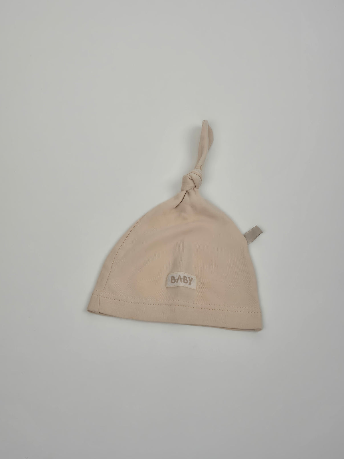 Měkoučká čepička ve velikosti 62 v neutrální béžové barvě s roztomilým uzlíkem na vršku. Minimalistický vzhled doplňuje malý štítek s nápisem BABY. Vyrobená z příjemného bavlněného materiálu, který je ideální pro citlivou pokožku miminek. Skvělý doplněk pro novorozence, hodí se jak pro holčičky, tak pro kluky.