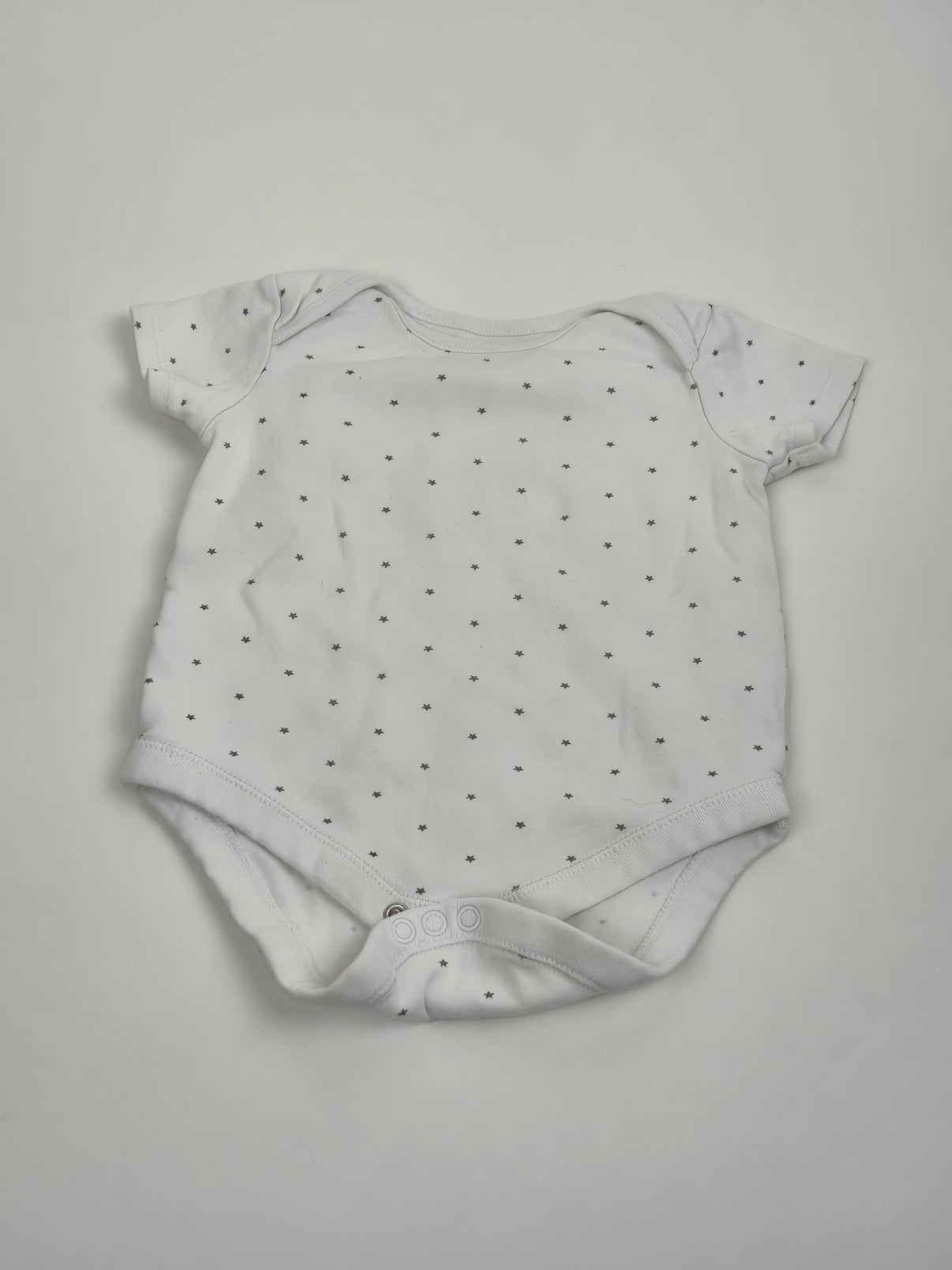 Bílé kojenecké body F&F ve velikosti 86 s krátkým rukávem je praktickým a zároveň roztomilým kouskem do každodenní výbavy. Drobné černé hvězdičky dodávají jemný a univerzální vzhled, vhodný pro holčičky i chlapečky. Díky pohodlnému střihu s překříženým výstřihem a zapínáním mezi nožičkami se body snadno obléká i přebaluje. Ideální volba na teplé dny nebo jako spodní vrstva.