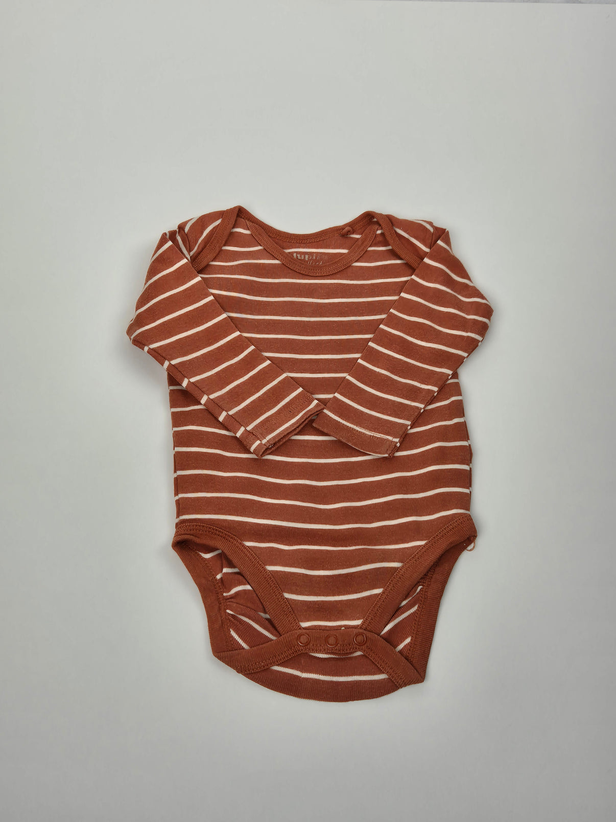 Stylové body s dlouhým rukávem značky Lupilu ve velikosti 62/68 v hřejivém rezavě hnědém odstínu s jemným krémovým proužkem. Příjemný bavlněný materiál a praktické zapínání mezi nožkami zajišťují pohodlí i snadné přebalování. Unisex kousek, který se hodí pro holčičky i kluky – ideální do každodenní výbavičky.
