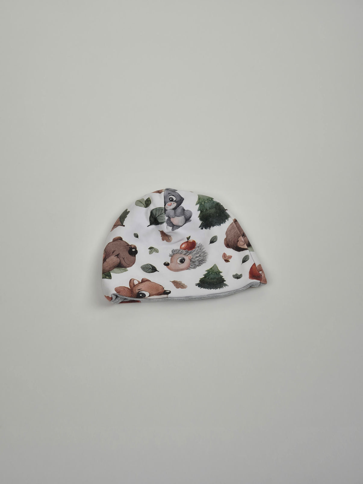 Roztomilá bavlněná čepička z české malovýroby ve velikosti 56, vhodná pro novorozence s obvodem hlavičky cca 40 cm. Jemný bílý podklad zdobí akvarelové motivy lesních zvířátek, jako je ježeček, medvídek nebo srneček – ideální na první výlety nebo jen tak do kočárku. Měkký a pružný materiál zajistí pohodlí a šetrnost k citlivé dětské pokožce. Unisex provedení pro holčičky i kluky.