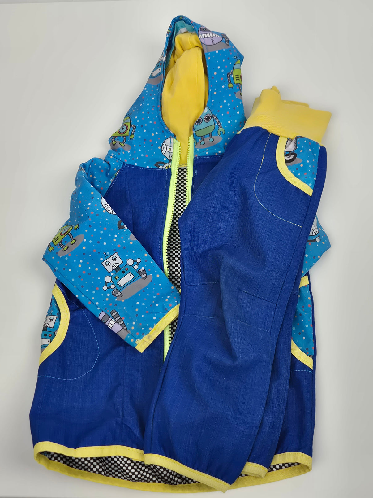 Barevný dětský softshellový komplet z české malovýroby je praktickým parťákem na jaro, podzim i chladnější letní dny. Bunda s kapucí i kalhoty kombinují veselý motiv robotů s kontrastní sytě modrou a žlutými detaily. Vnější softshellový materiál odolá větru i drobnému dešti, zatímco vnitřní podšívka s puntíky zaručí pohodlí. Kalhoty mají pružný pas i náplety na nohavicích. Ideální na hřiště, do školky i na výlety. Vhodné pro kluky.