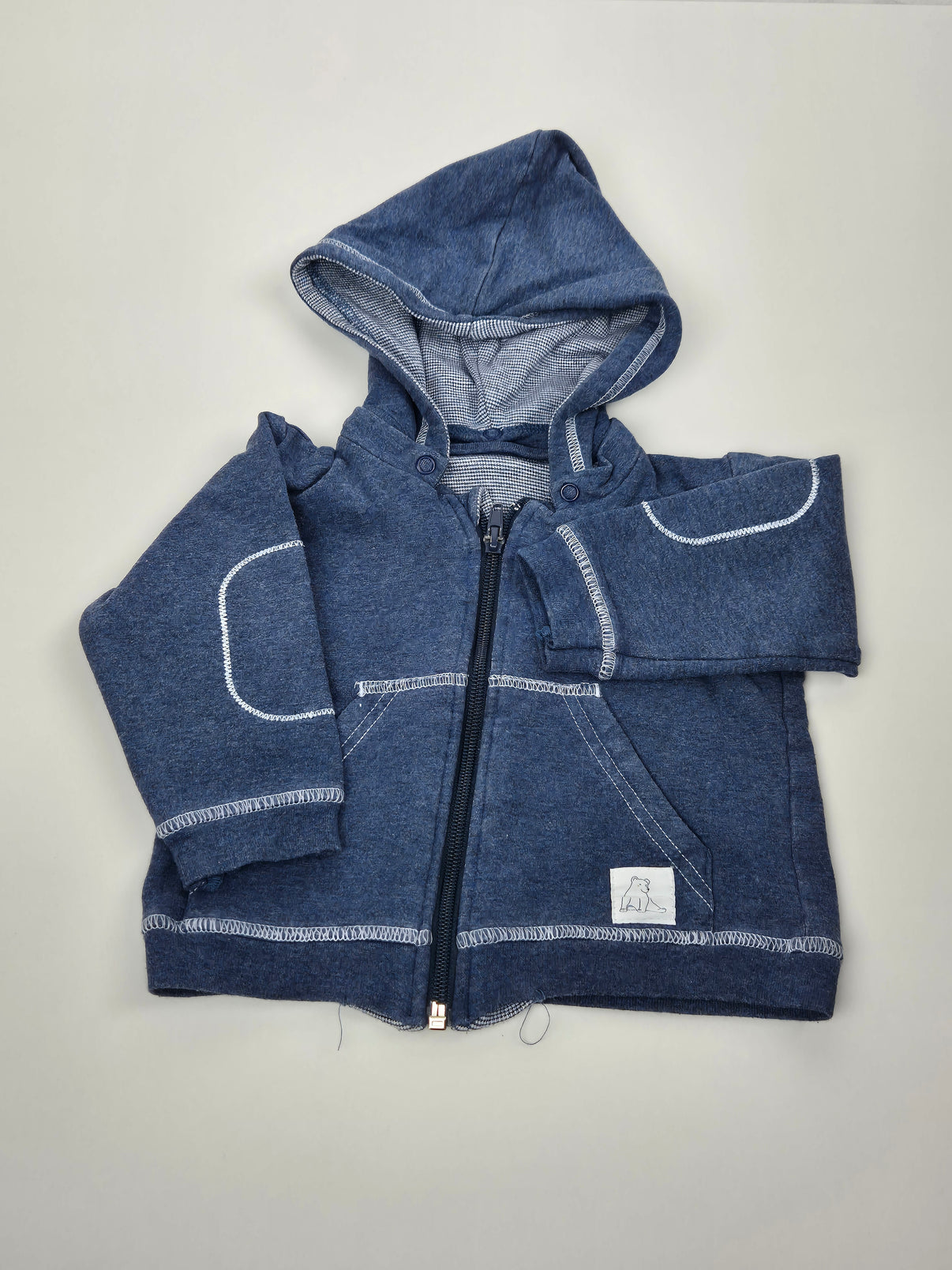 Stylová mikina s kapucí ve velikosti 62/68 v tmavě modré barvě s kontrastním bílým prošitím. Praktický zip po celé délce a přední kapsy z ní dělají pohodlný a funkční kousek na každý den. Jemný bavlněný materiál je příjemný na nošení a hodí se jak na doma, tak ven.