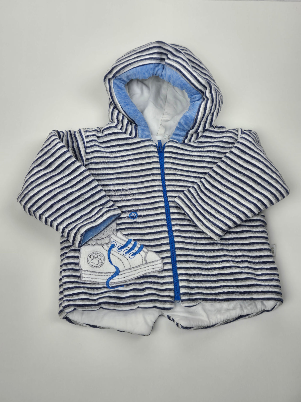Roztomilá pruhovaná mikina ve velikosti 68 v kombinaci bílé, modré a tmavě modré s vyšitým motivem sportovní boty na přední straně. Měkoučký materiál s podšívkou a kapucí poskytne příjemné teplo při chladnějších dnech. Zip po celé délce usnadňuje oblékání a svlékání. Ideální kousek pro malé kluky – do kočárku, na hřiště i na každodenní nošení.