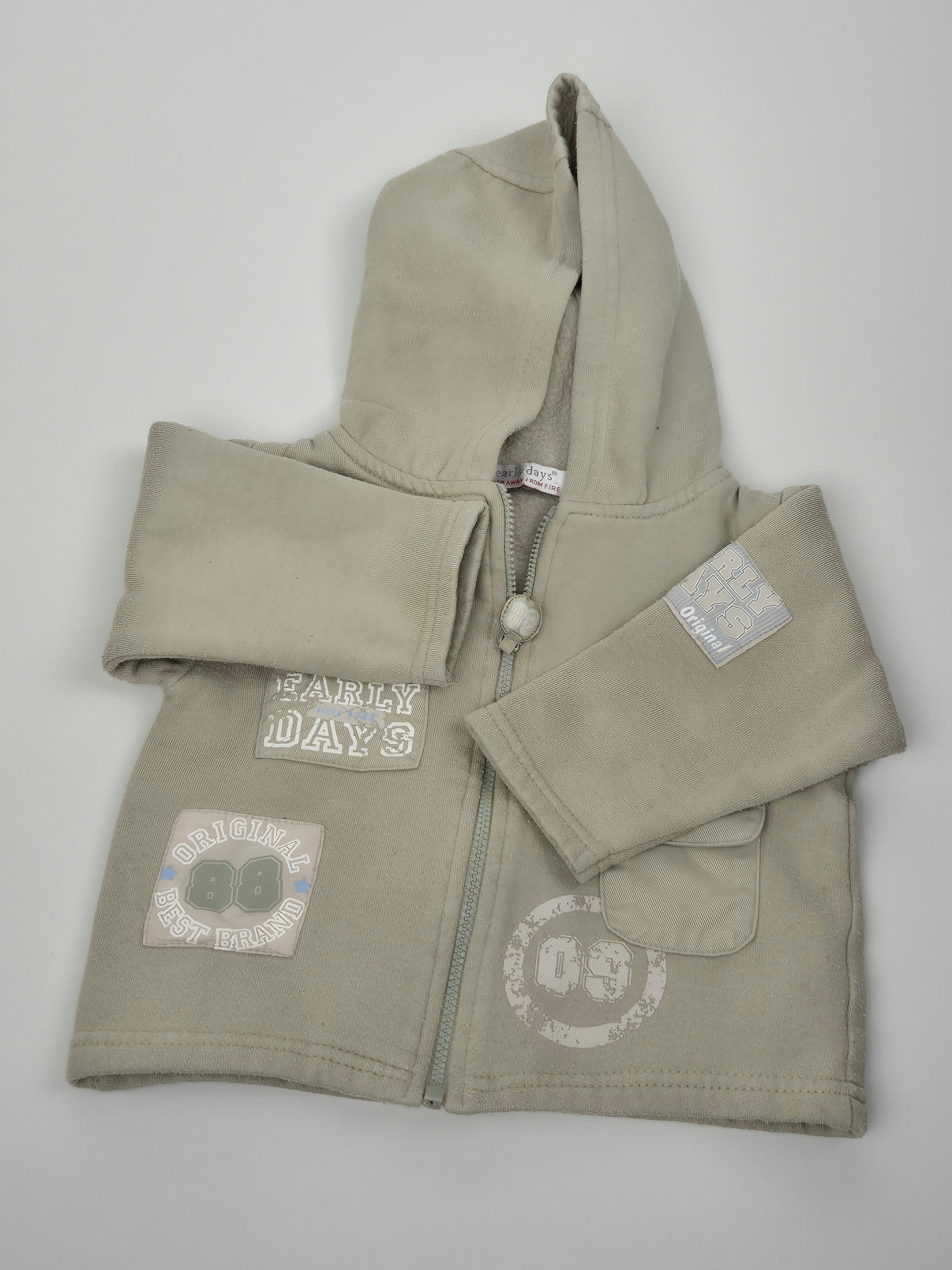 Pohodlná mikina s kapucí značky Early Days v tlumeném béžovém odstínu, ideální na jaro i podzim. Zdobená sportovními nápisy a nášivkami, které jí dodávají cool klučičí vzhled. Měkký vnitřní chloupek zahřeje a zip usnadní oblékání. Skvělý kousek na hřiště, do školky nebo na výlety – pohodlný, praktický a stylový.