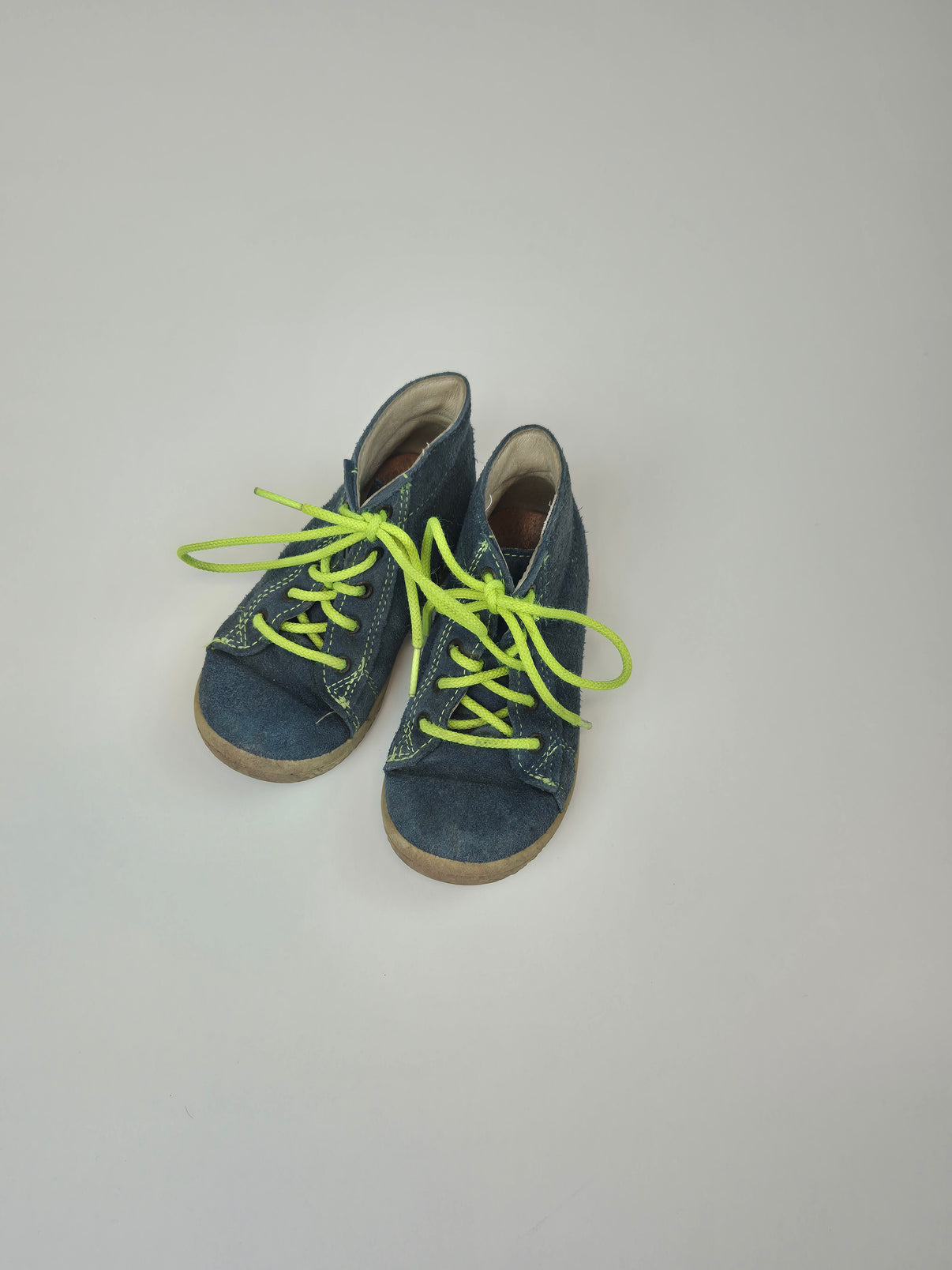 Stylové kotníkové botičky Ricosta Pepino v tmavě modrém semišovém provedení s výraznými neonově zelenými tkaničkami. Měkký materiál a pevnější konstrukce zajistí oporu při každodenním nošení. Praktická a pohodlná obuv pro kluky, vhodná na jaro i podzim – do školky, na hřiště i na vycházky.