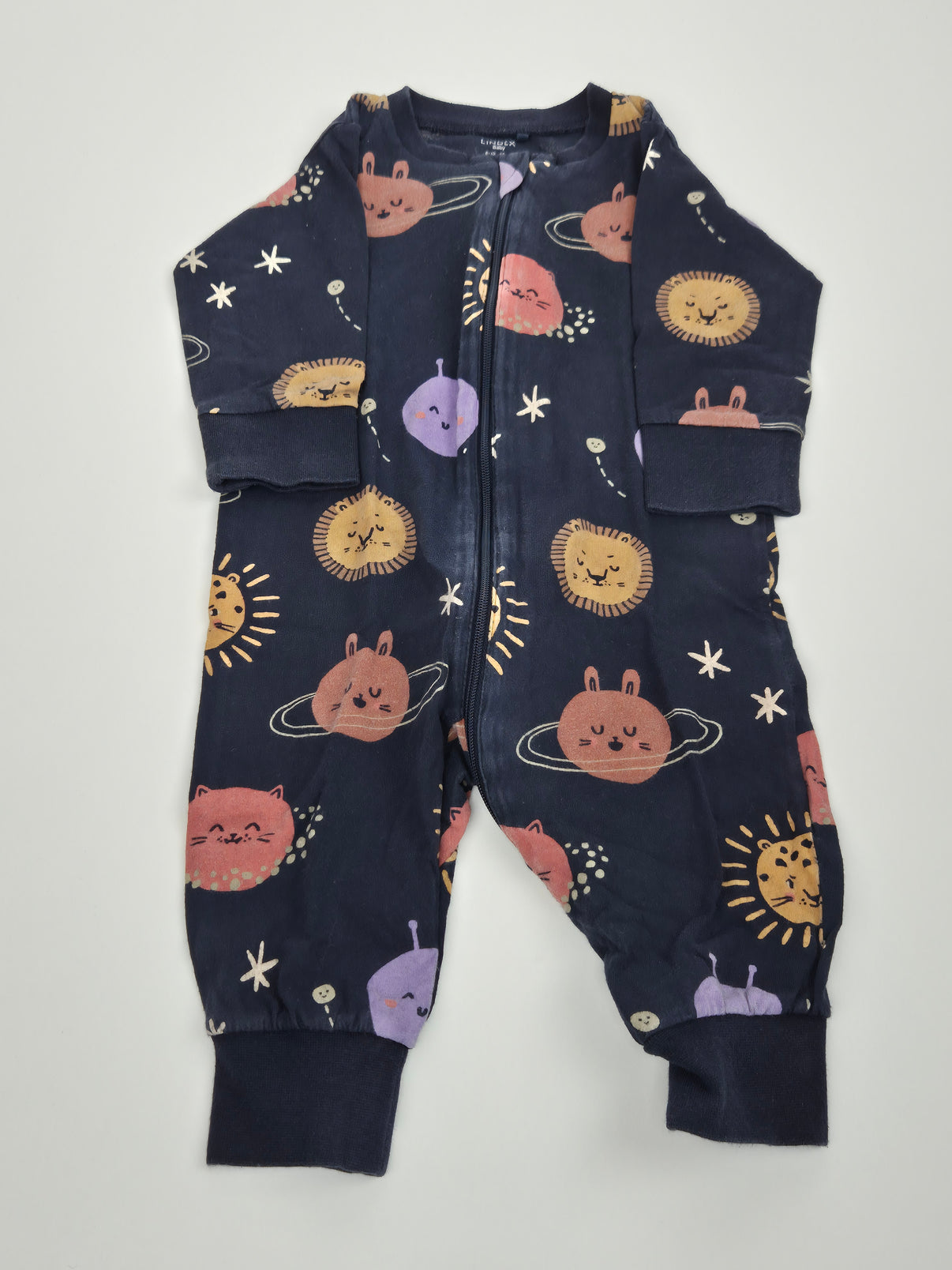 Roztomilý overal Lindex v tmavě modré barvě s originálním vesmírným motivem – planety a hvězdy mají podobu usměvavých zvířátek v odstínech fialové, růžové, oranžové a béžové. Měkký a pohodlný materiál se postará o klidný spánek i pohodlí během dne. Praktický zip po celé délce a ohrnovací rukávy i nohavice usnadní oblékání i přizpůsobení aktuálním potřebám miminka.
