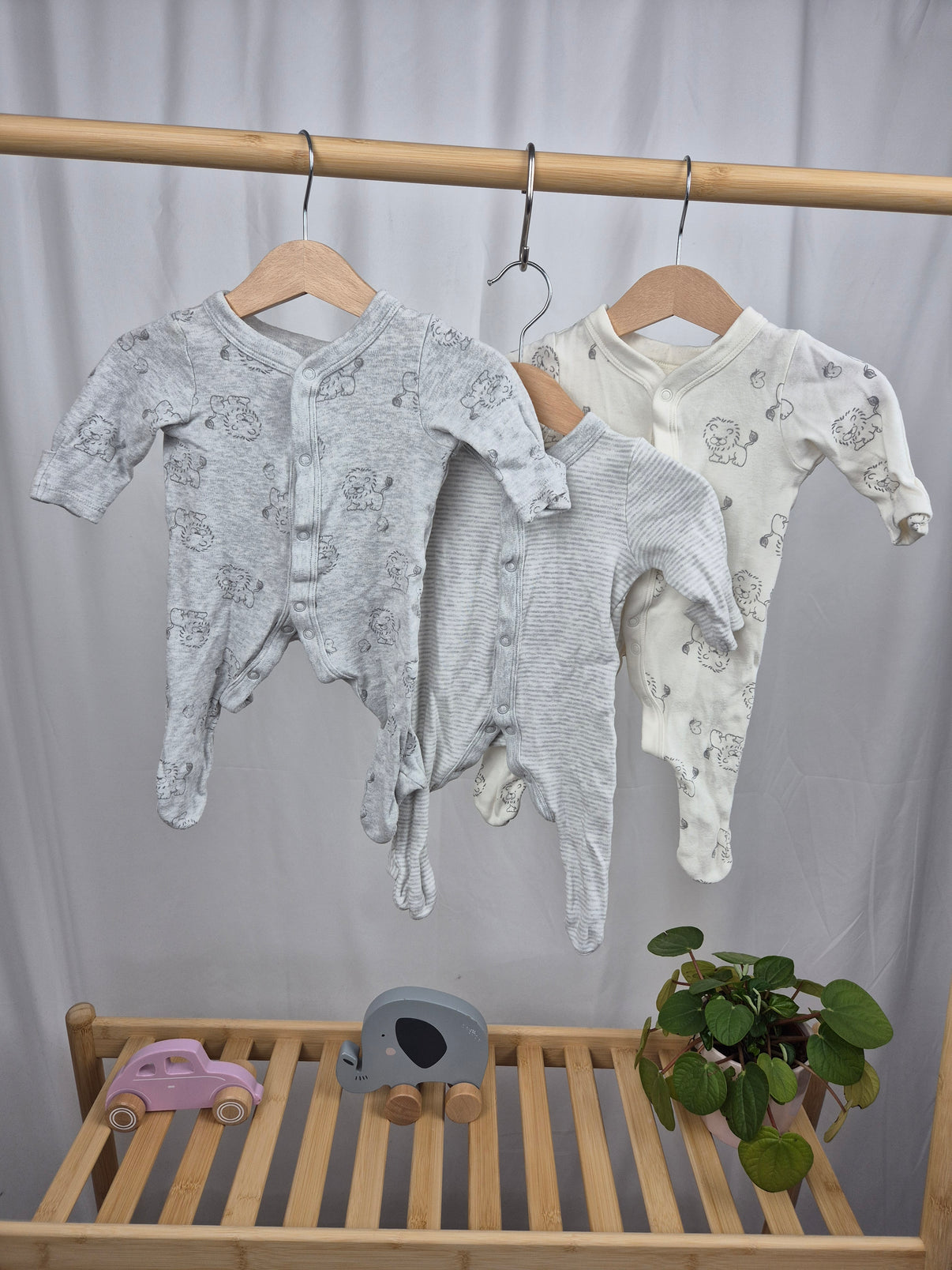 Neutrální sada 3ks dupaček značky Marks & Spencer ve velikosti 54 je ideální pro miminko od prvních dnů života. Každé pyžamko má dlouhý rukáv, uzavřené nožičky a praktické zapínání na patentky po celé délce. V sadě najdeš: