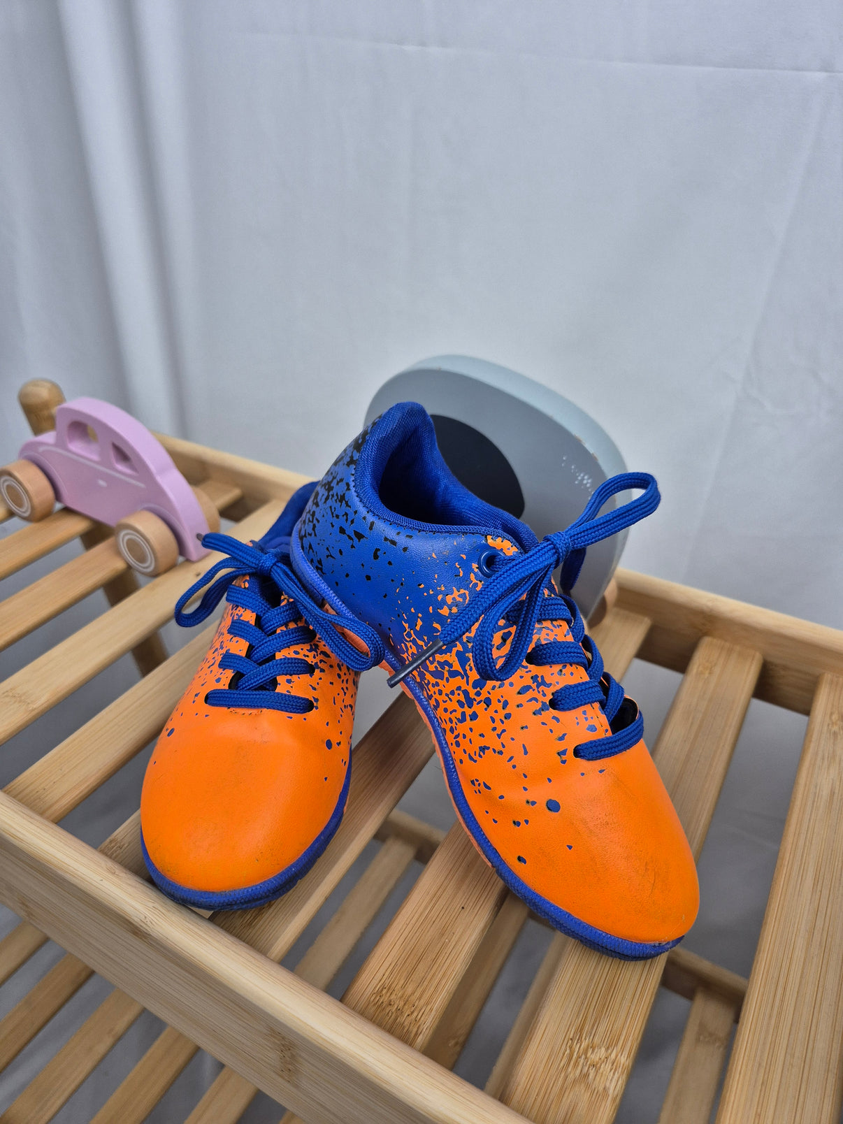Sportovní dětská obuv v nápadité kombinaci sytě oranžové a královsky modré barvy, která zaujme na první pohled. Lehký a prodyšný materiál s robustní podrážkou s výrazným vzorkem nabízí skvělou oporu při pohybu – ideální volba na tréninky, tělocvik nebo volný čas venku. Barevné stříkance a kontrastní šněrování dodávají botám hravý a energický styl. Vhodné pro kluky, kteří milují pohyb a výrazný design.