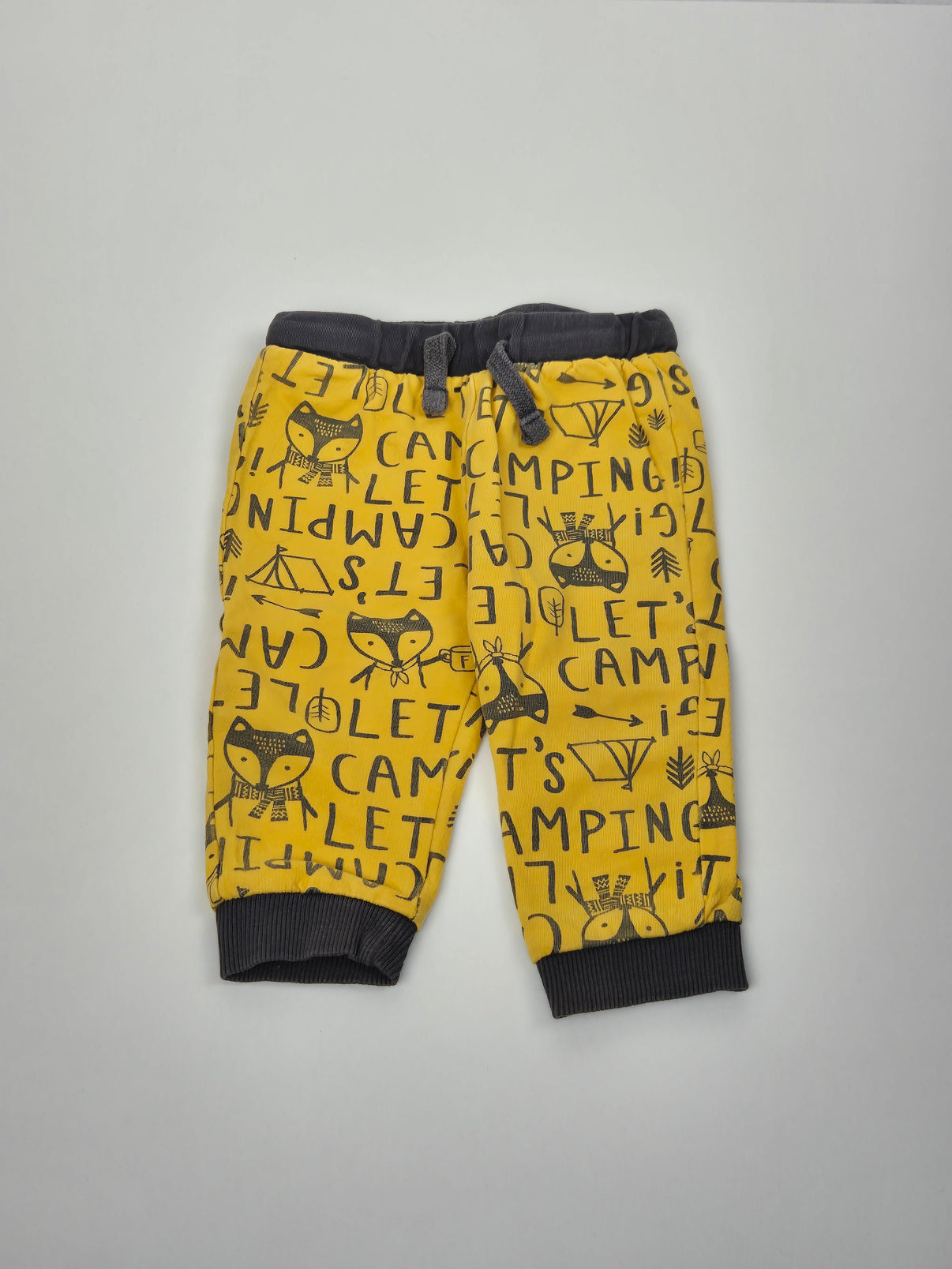 Veselé tepláky značky Pepco ve velikosti 74 v zářivě žluté barvě s hravým potiskem zvířátek, teepee a nápisů „Let’s camping“. Měkký bavlněný materiál a pružný pas se šňůrkou zajistí pohodlí při každém dobrodružství. Kontrastní tmavě šedé náplety na nohavicích drží tepláčky na místě. Skvělý kousek pro malé kluky na doma, do kočárku i na výlety do přírody.