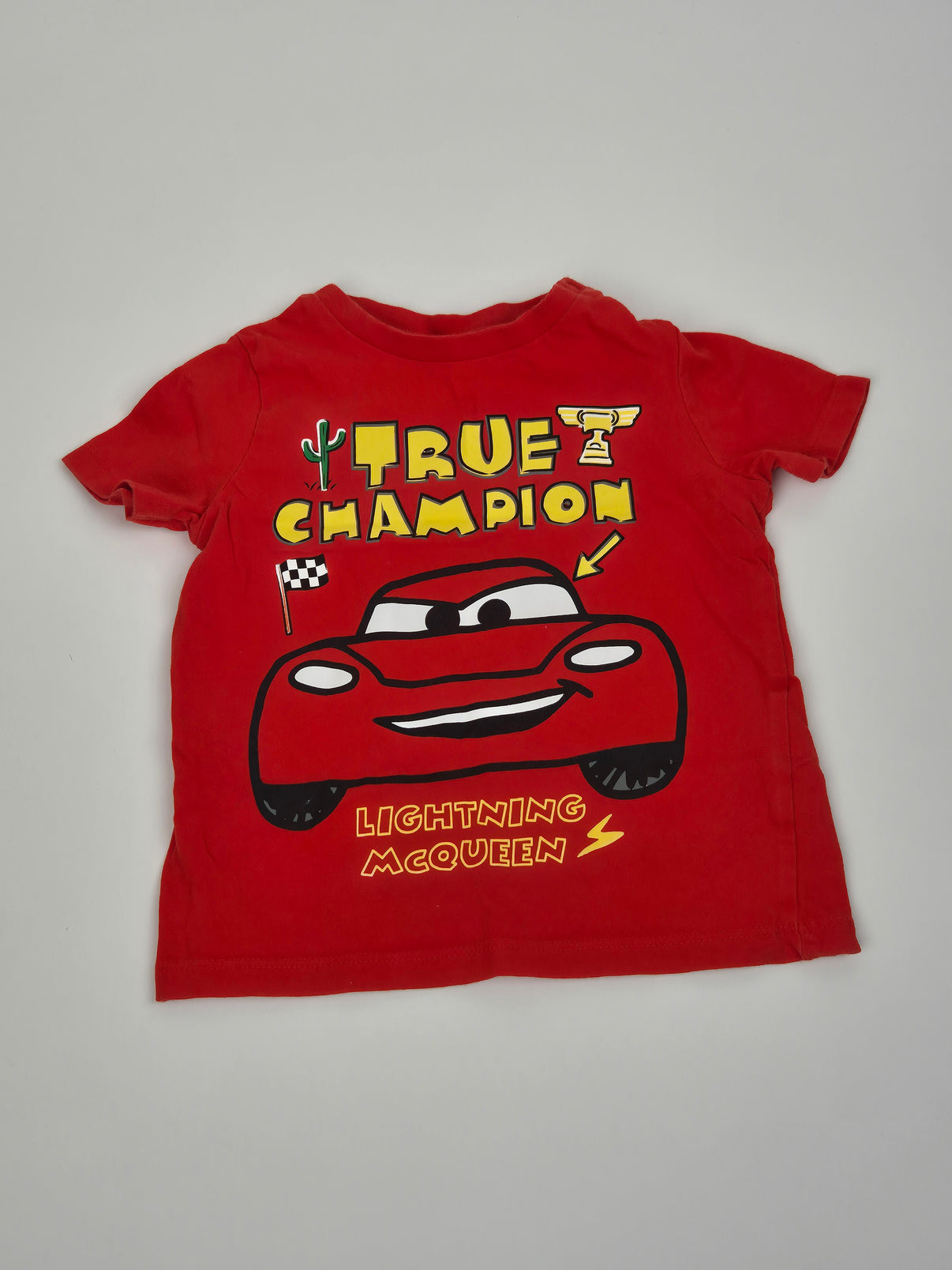 Parádní červené tričko pro chlapečka od značky F&F s motivem Bleska McQueena z oblíbeného filmu Auta (Cars). Přední stranu zdobí výrazný potisk s nápisem "True Champion" a jménem Lightning McQueen, doplněný ikonickou závodní vlajkou a trofejí. Tričko ve velikosti 86 je z příjemného materiálu, ideální na běžné nošení, do školky nebo na výlety. Skvělý kousek pro malého fanouška rychlých kol!