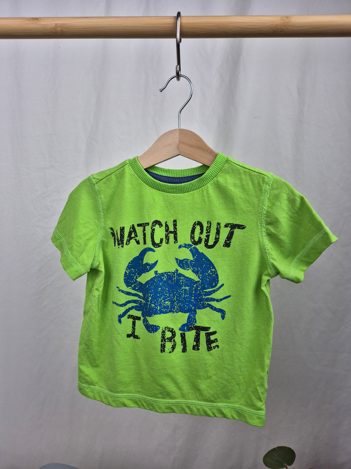 Veselé chlapecké tričko F&F ve velikosti 92 v nepřehlédnutelné limetkově zelené barvě rozzáří každý letní den. Přední stranu zdobí vtipný potisk modrého kraba s nápisem „Watch out – I bite“, který si malí raubíři zamilují. Ideální kousek na dovolenou, výlety i běžné nošení.