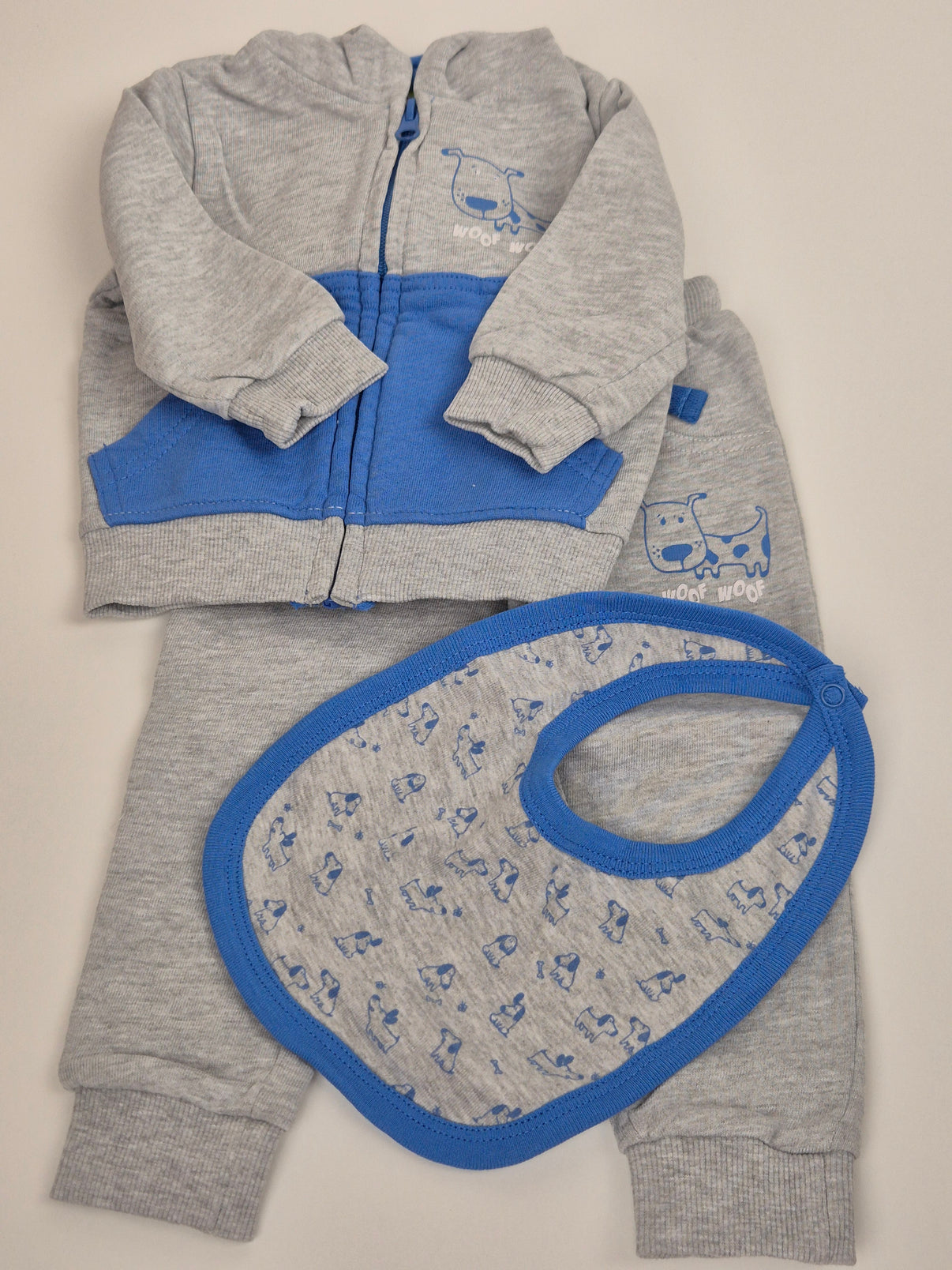 Roztomilý třídílný set značky Venero ve velikosti 68, který se skládá z mikiny na zip, pohodlných tepláčků a slintáčku. Vše je laděno do kombinace světle šedé a královsky modré, s veselým motivem pejska a nápisem „Woof Woof“. Slintáček se zapínáním na druk je potištěný drobnými pejsky. Skvělý outfit na každý den pro malého chlapečka – pohodlný, měkký a připravený na hraní i odpočinek.