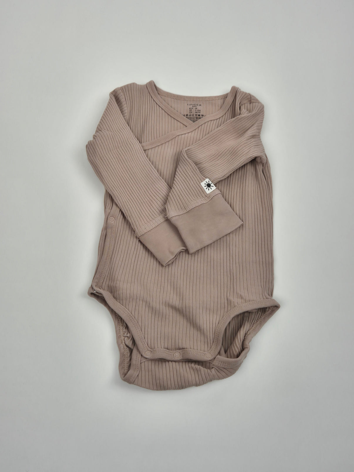 Zavinovací body Lindex v jemném pudrově béžovém odstínu z příjemného žebrovaného materiálu, který krásně pruží a přizpůsobí se miminku. Praktické boční zapínání na patentky usnadní oblékání a přebalování, ideální volba pro novorozence i menší kojence. Dlouhé rukávy s přetahovacími náplety pro ochranu ručiček – ideální na spaní i běžné nošení. Neutrální unisex kousek, který se hodí do každé výbavičky.