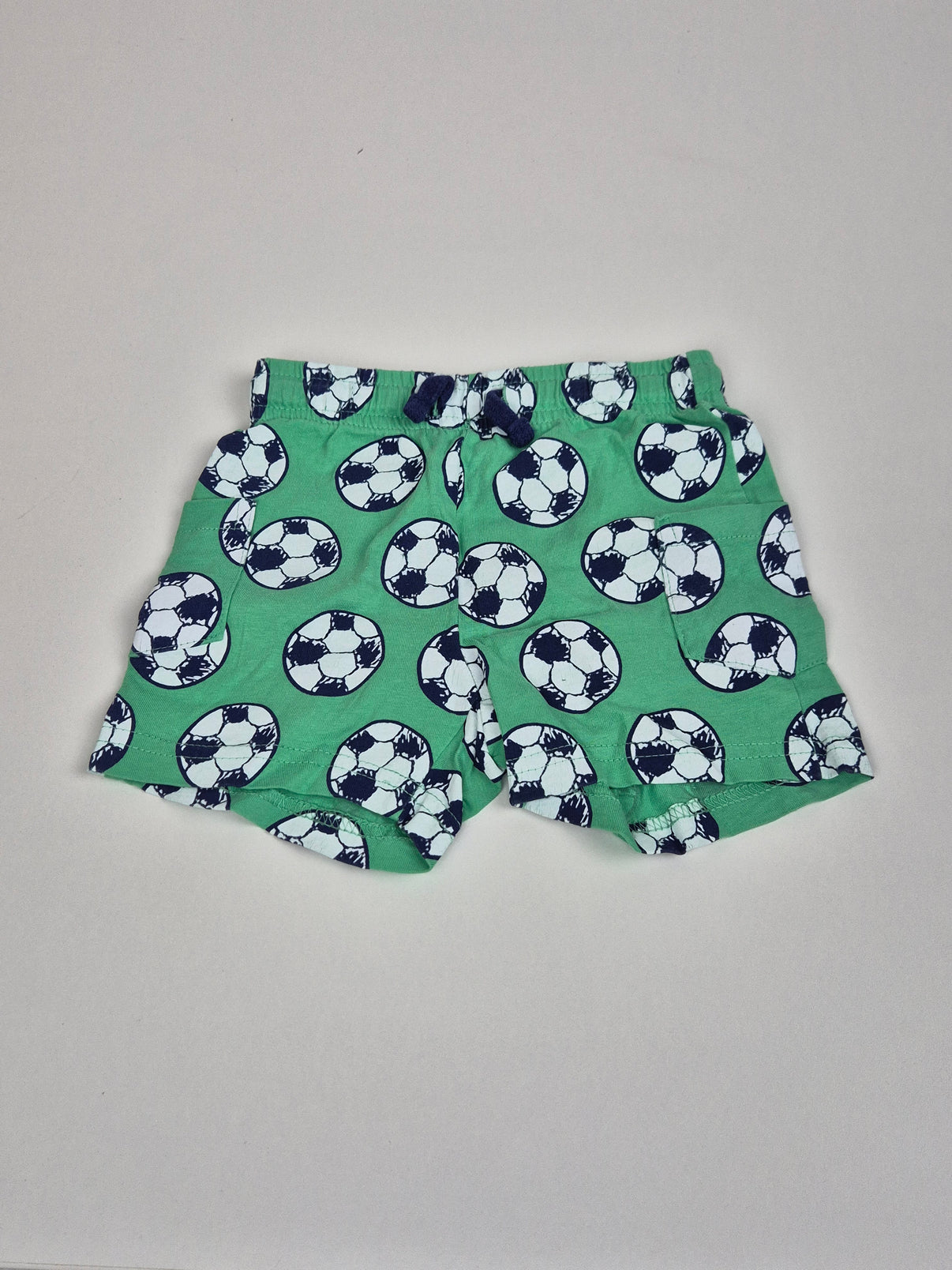Letní kraťasy Pepco ve velikosti 80 s potiskem fotbalových míčů. Světle zelený základ doplněný námořnicky modrými detaily působí svěže a sportovně. Pohodlný pas na gumu se šňůrkou na stažení zajišťuje, že kraťasy dobře sedí.