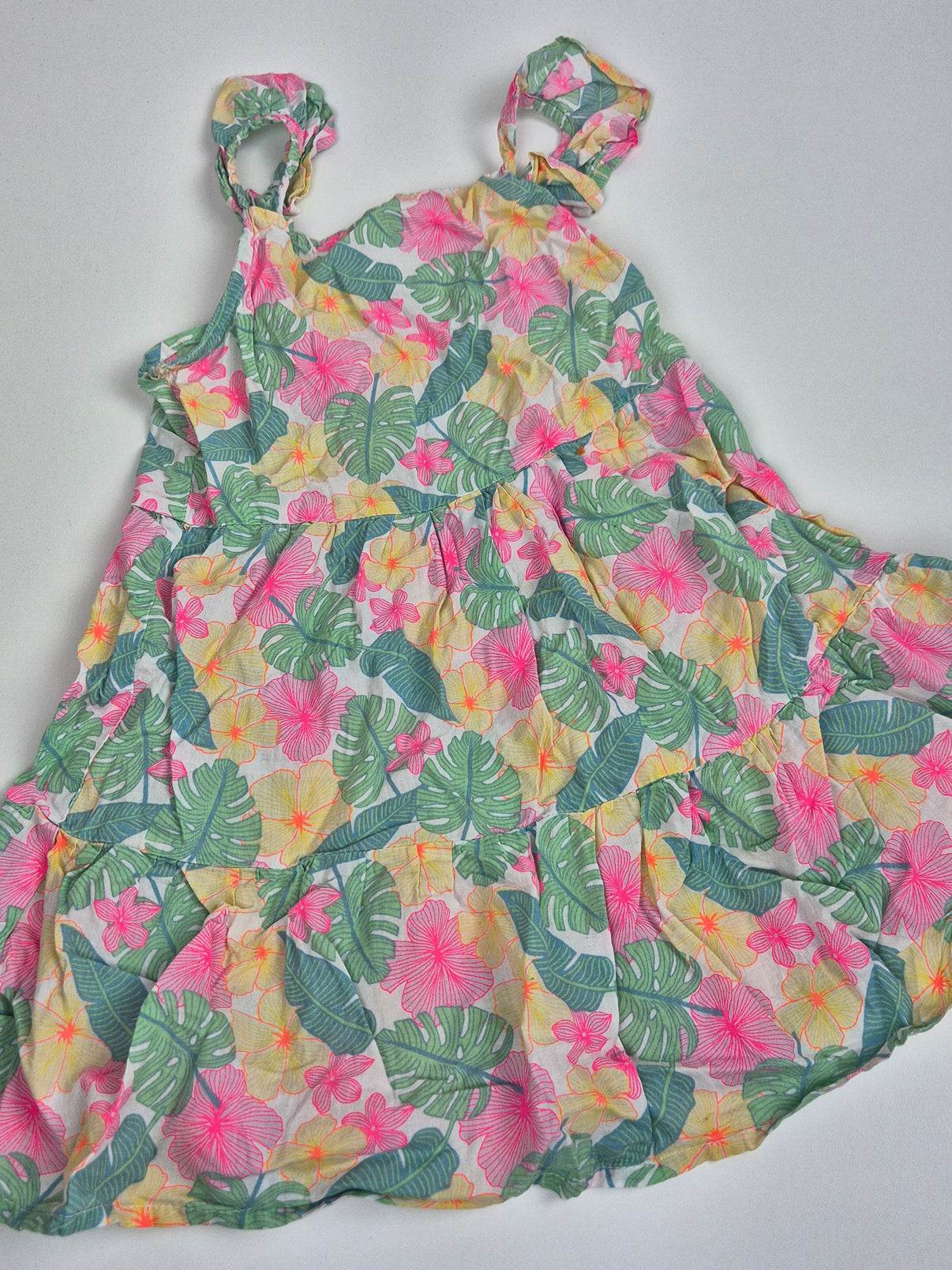 Letní šaty značky Primark s veselým tropickým vzorem v kombinaci světlého podkladu, zelených listů a růžovo-žlutých květů. Lehounký materiál a vzdušný, rozšířený střih krásně splývají a jsou ideální na horké letní dny, dovolenou i běžné nošení. Ramínka s jemným řasením dodávají šatům hravý a holčičí vzhled. Skvělý kousek pro holčičku, který udělá radost na první obléknutí.