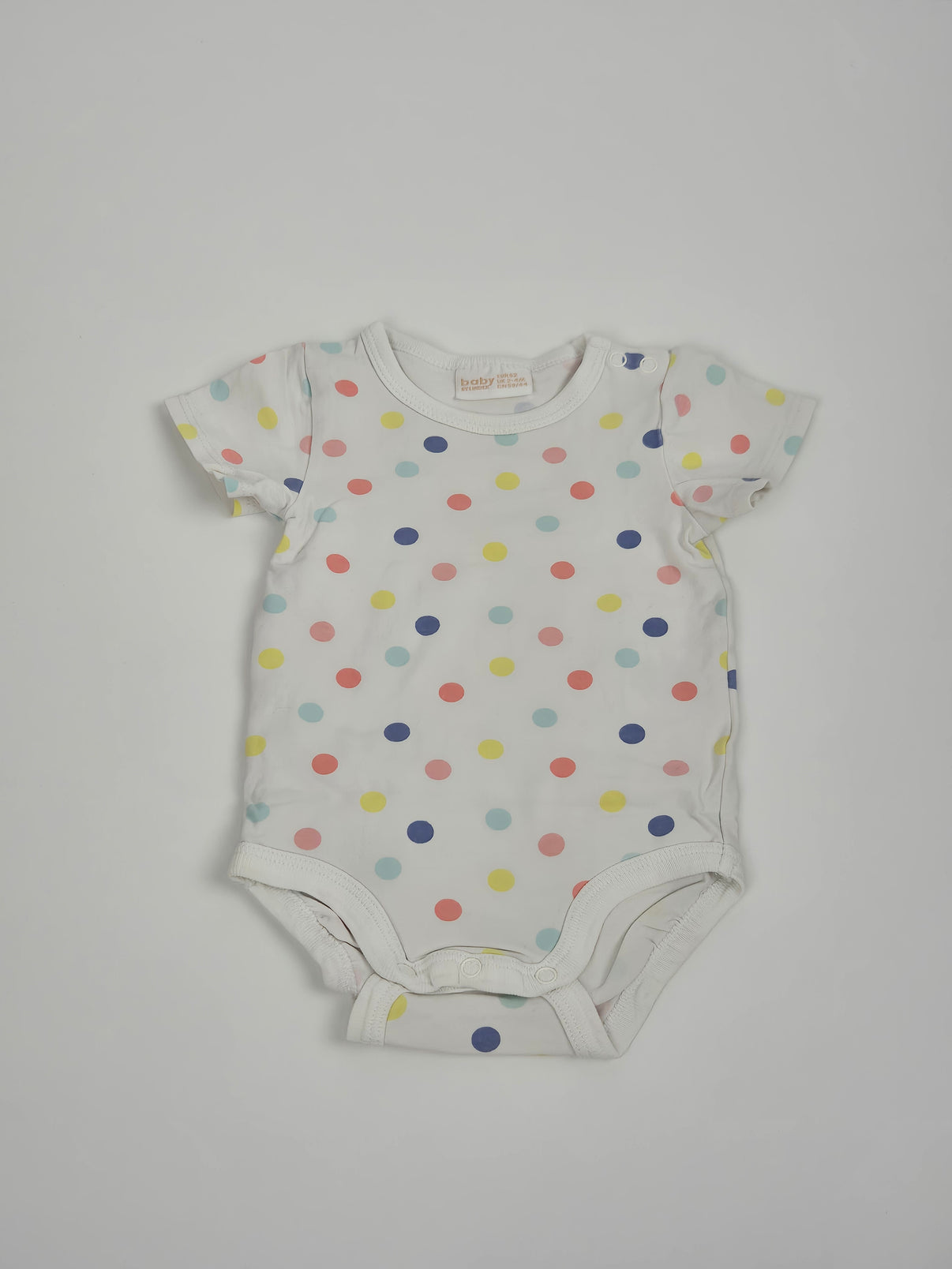 Veselé krátkorukávové body značky Lindex ve velikosti 62 je jako stvořené pro malé holčičky. Základ tvoří jemná bílá barva posetá barevnými puntíky v odstínech růžové, žluté, modré a mentolové – ideální na každodenní nošení i letní dobrodružství. Praktické zapínání na rameni a mezi nožičkami usnadní oblékání a přebalování. Lehký a prodyšný bavlněný materiál zajistí pohodlí po celý den.