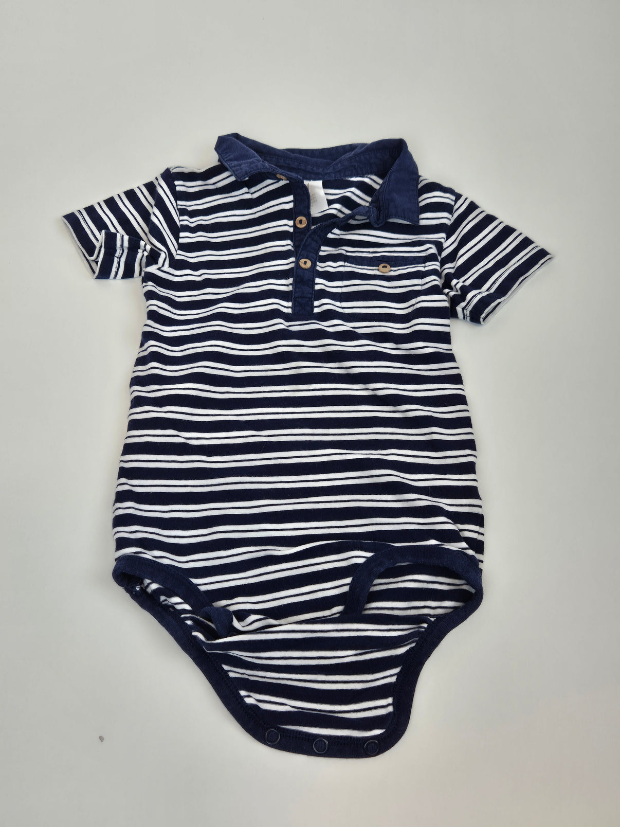 Stylové chlapecké body s krátkým rukávem v námořnickém designu s bílomodrými proužky. Límec a knoflíčky na hrudi dodávají body vzhled košile, malá kapsička vpředu je roztomilým detailem. Praktické zapínání mezi nožičkami usnadní přebalování. Pohodlný a zároveň elegantní kousek pro každodenní nošení i slavnostnější příležitosti. Značka Lindex.