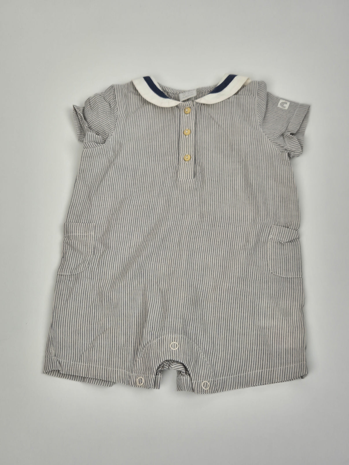 Stylový letní kraťasový overal od značky Lindex ve velikosti 62 zaujme elegantním námořnickým vzhledem. Jemný proužek v šedo-bílé kombinaci doplňuje výrazný námořnický límeček vzadu s tmavě modrým lemováním a drobné detaily jako dřevěné knoflíčky vpředu. Krátké rukávky s nařasením dodávají celkovému vzhledu něžný nádech. Overal má praktické zapínání mezi nožičkami pro snadné přebalování.