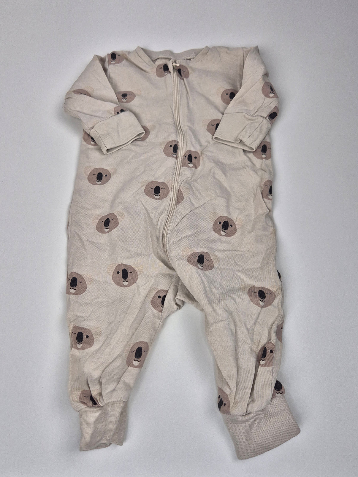 Béžový overal značky Lindex s veselým potiskem koal po celé ploše a velkou aplikací koaly na zadečku. Zapínání na zip usnadňuje oblékání i přebalování, rukávy i nohavice mají náplety pro pohodlné nošení. Jemný bavlněný materiál je ideální na spaní i denní nošení pro miminko.