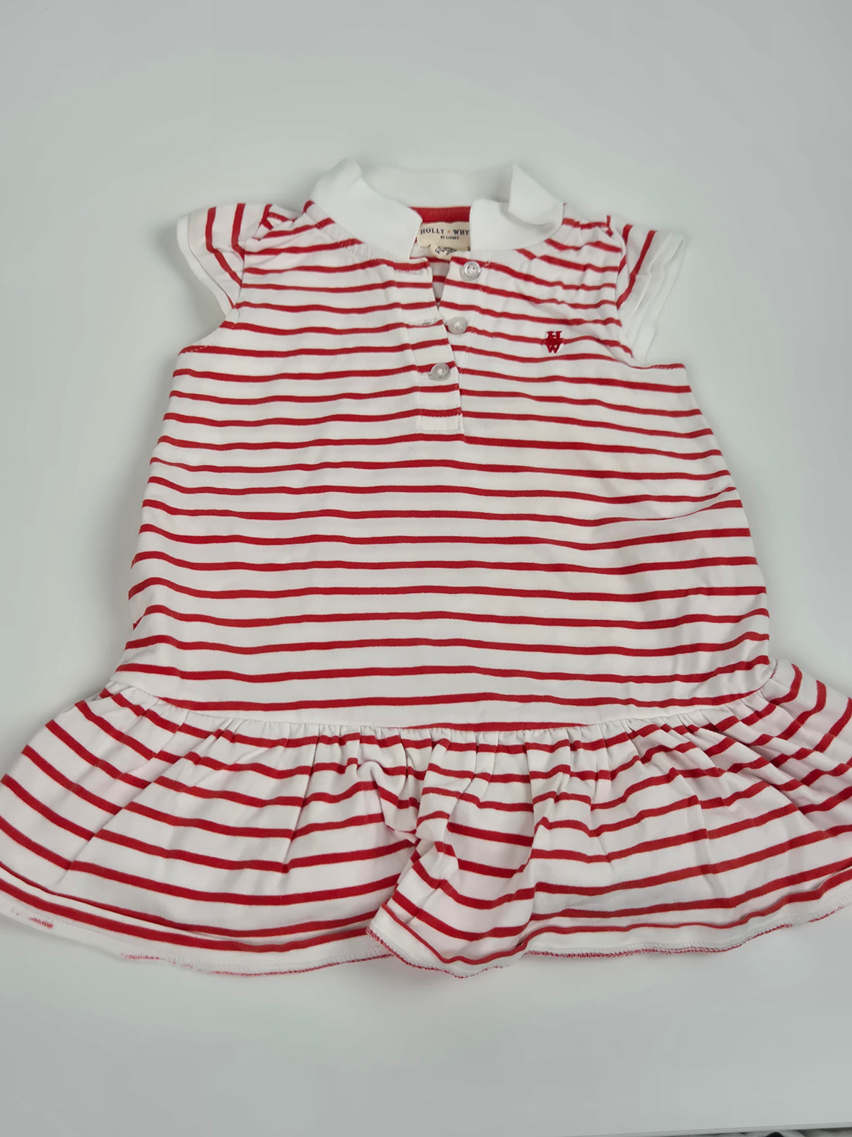 Pruhované šaty Holly & Whyte by Lindex ve velikosti 86 mají bílo-červený design s límečkem a zapínáním na knoflíčky. Jsou vyrobené z příjemné bavlny a díky volánkové sukýnce působí hravě...