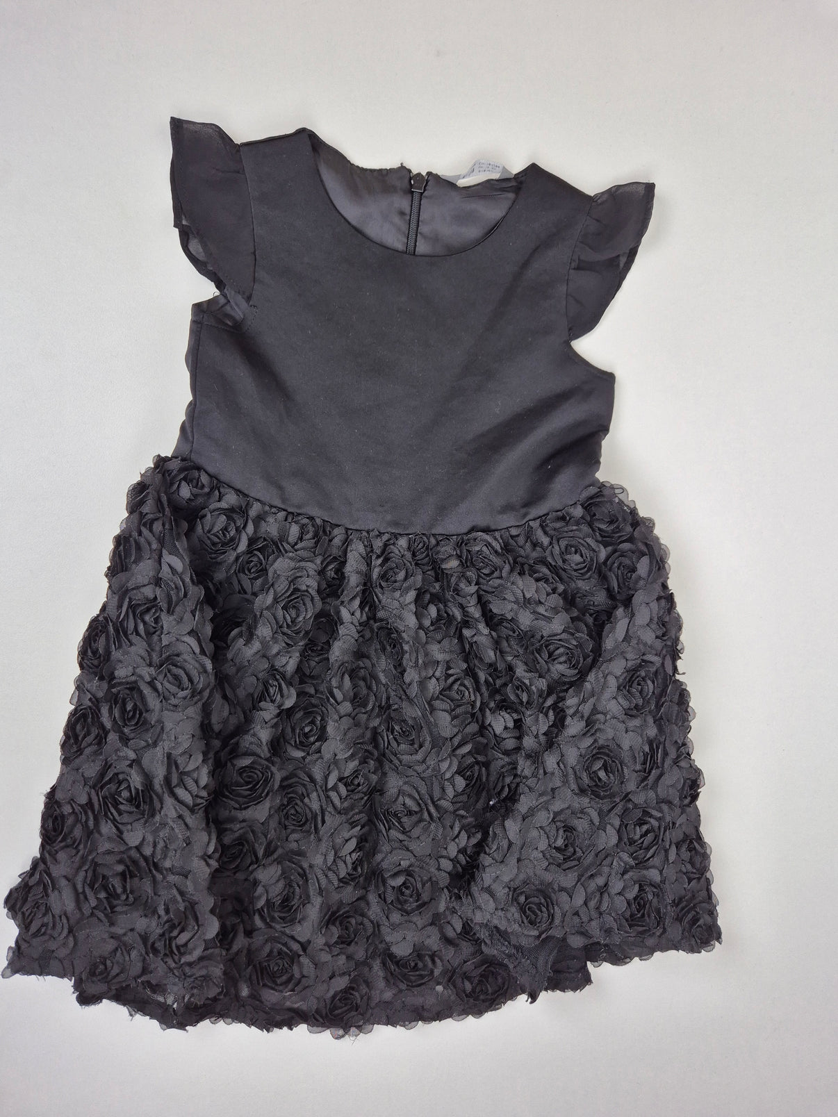 Elegantní dívčí šaty značky Lindex ve velikosti 104 jsou jako stvořené pro slavnostní příležitosti. Horní část je z jemného, hladkého materiálu s decentními volánkovými rukávy, zatímco bohatá sukně je celá pokrytá plastickými květy ve tvaru růží, které dodávají šatům luxusní vzhled. Celé šaty jsou v sytě černé barvě, což z nich dělá výrazný a zároveň nadčasový kousek. Zapínání vzadu na zip usnadňuje oblékání. Ideální volba na svatbu, oslavu nebo focení pro malou slečnu, která chce zazářit.