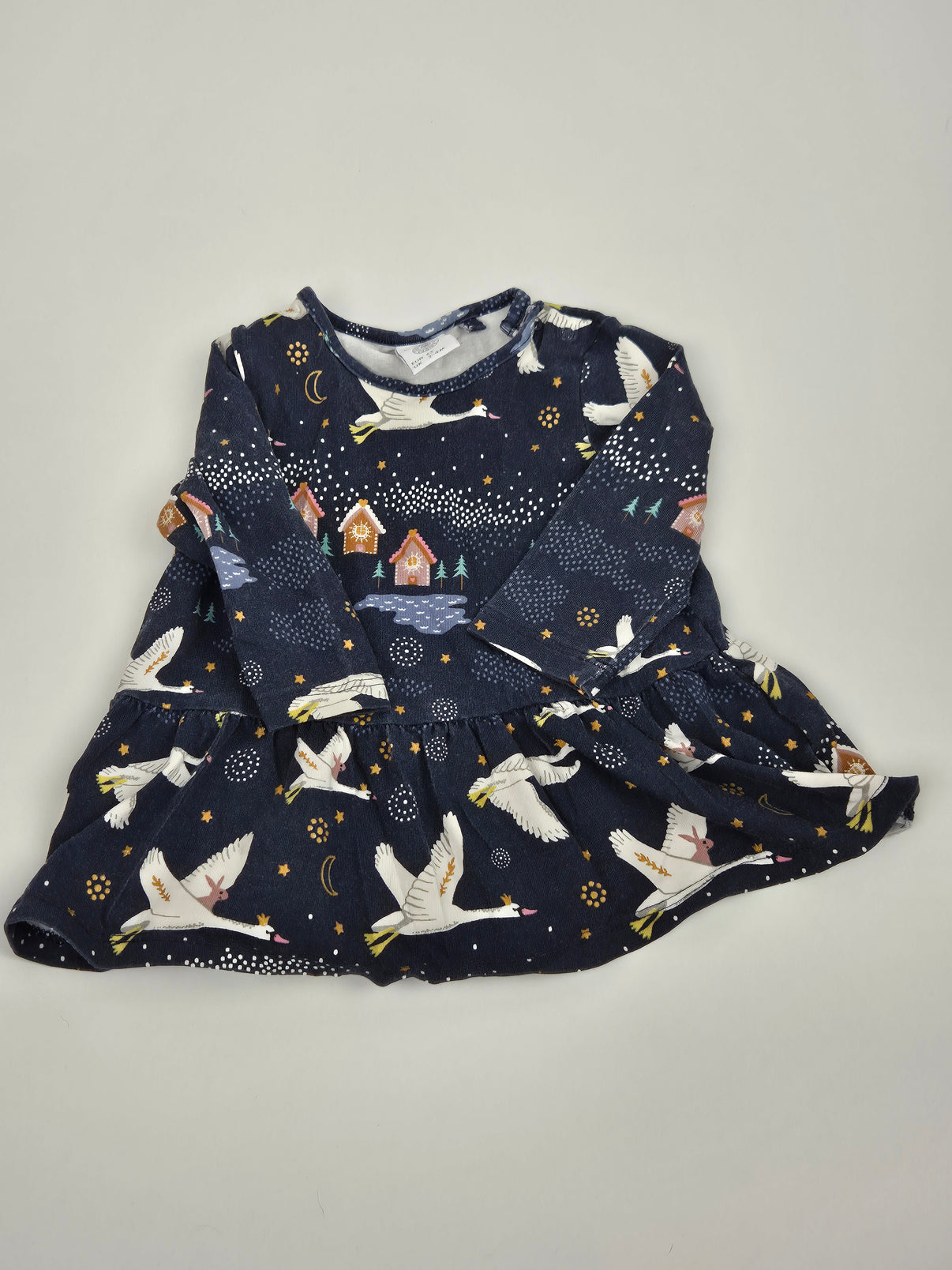 Kouzelně laděné šatičky značky Lindex v tmavě modré barvě zdobí pohádkový vzor s letícími husami, zasněženými chaloupkami a hvězdnou noční oblohou. Dlouhé rukávy a měkký bavlněný materiál zajišťují pohodlí během celého dne – ideální volba pro zimní období, vánoční focení nebo návštěvu u babičky. Romantický kousek pro malé holčičky, který okouzlí na první pohled.