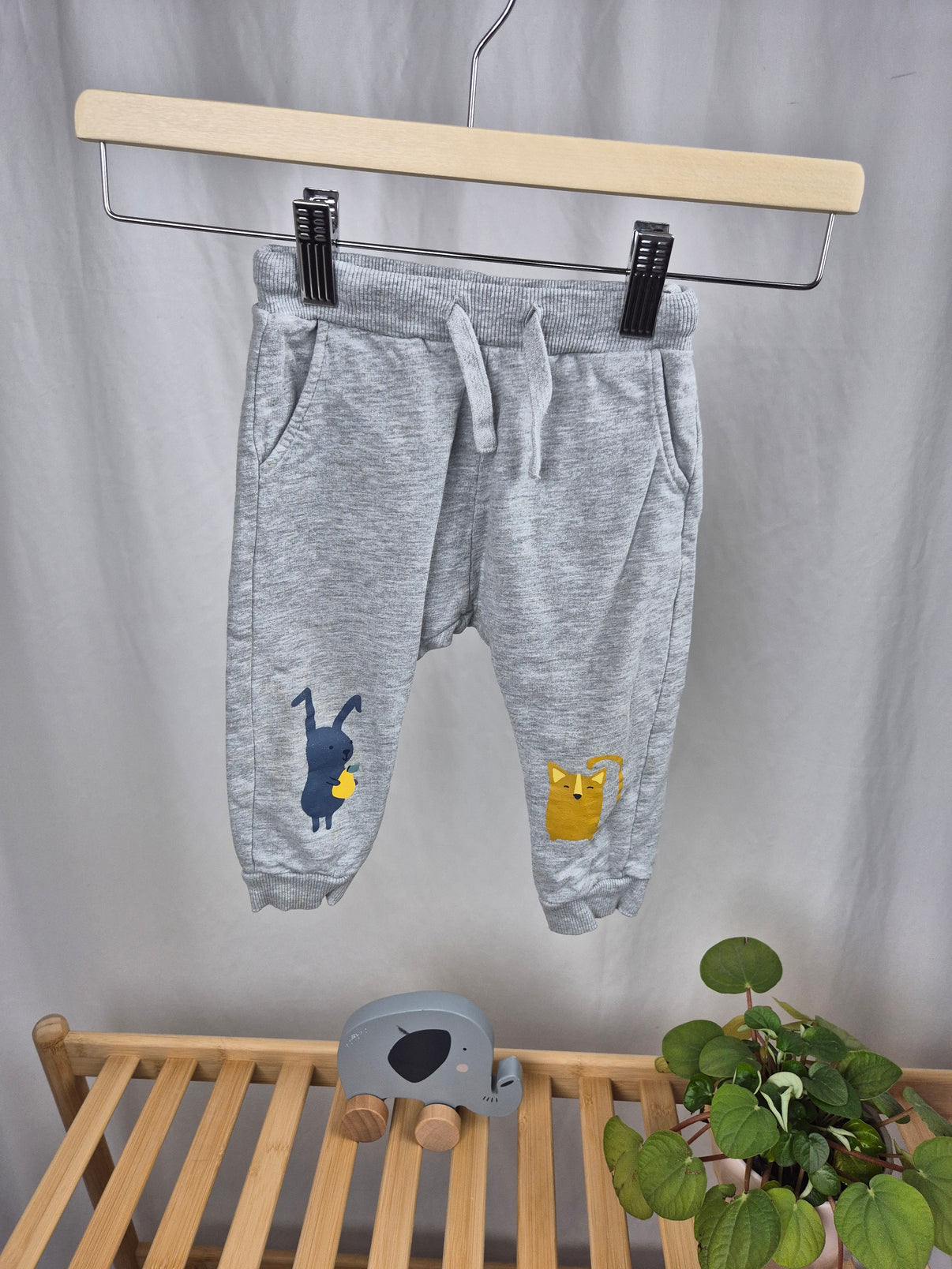 Pohodlné tepláčky od značky Lindex v světle šedé barvě s roztomilými zvířátky – modrým zajíčkem a žlutou kočičkou – na nohavicích přináší hravost do každodenního oblékání. Měkký materiál, pružný pas se šňůrkou a žebrované lemy zaručují maximální pohodlí při hře i odpočinku. Díky neutrálnímu tónu a milému designu jsou vhodné pro holčičku i chlapečka. Skvělé na doma, do školky i na ven.