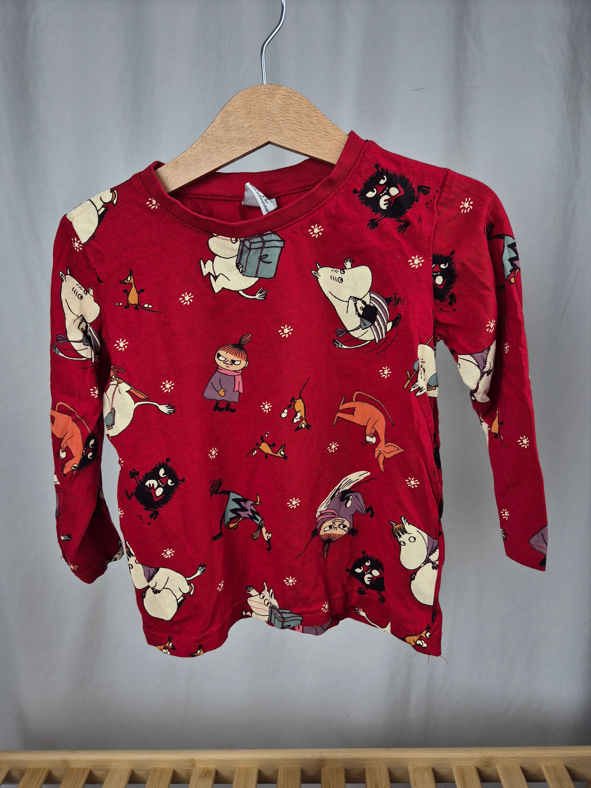 Vánoční tričko Lindex v sytě červené barvě s dlouhým rukávem, zdobené celoplošným potiskem postaviček Mumínků. Příjemný bavlněný materiál zajistí pohodlí při nošení.