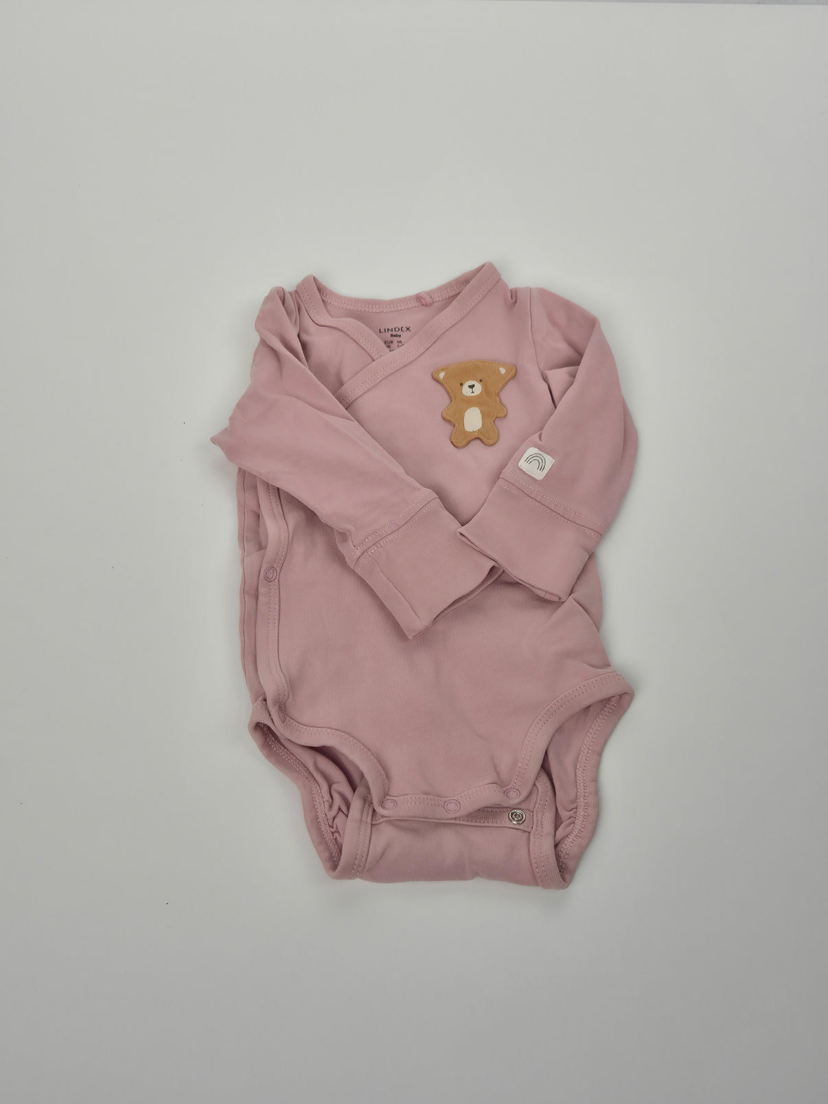 Zavinovací body od značky Lindex v tlumené starorůžové barvě zaujme roztomilou aplikací medvídka na hrudi. Praktický zavinovací střih usnadňuje oblékání bez nutnosti přetahování přes hlavičku, zatímco prodlužovací část v rozkroku umožňuje delší využití, jak miminko roste. Měkký a příjemný materiál zajistí maximální pohodlí. Ideální kousek pro malé holčičky – na doma, do kočárku i na mazlení.
