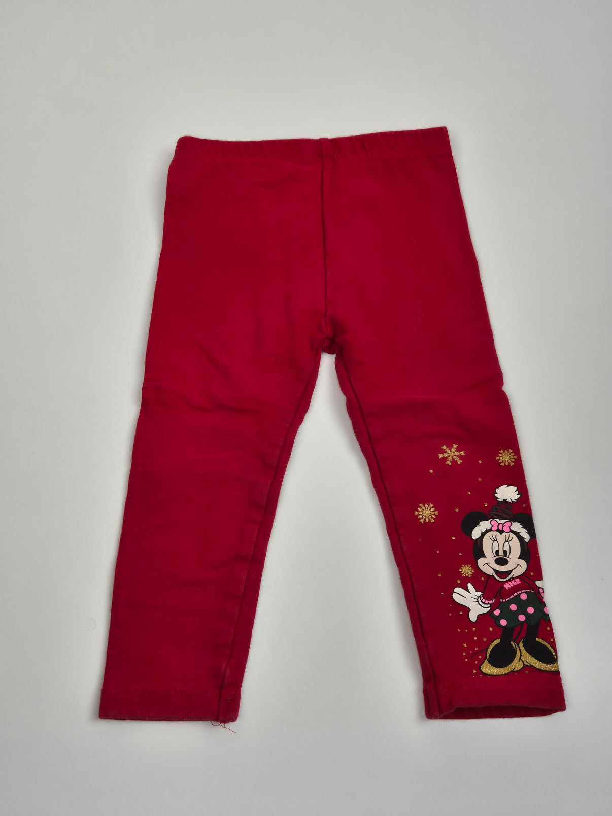 Pohodlné dětské legíny v sytě červeném vánočním odstínu, které na první pohled zaujmou roztomilým motivem Minnie Mouse v zimním outfitu. Potisk doplňují zlaté sněhové vločky, díky kterým legíny působí slavnostně a hravě. Pružný pas a měkký bavlněný materiál zajistí pohodlí při celodenním nošení – ideální na adventní období, focení i běžné zimní dny.