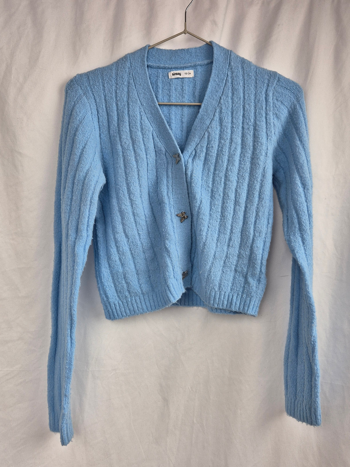 Krásný krátký svetřík Sinsay v jemné světle modré barvě. Měkoučký žebrovaný úplet, zapínání na knoflíky a pohodlný střih dělají z tohoto kousku ideální volbu pro chladnější dny. Snadno se kombinuje s džíny, sukní i legínami.
