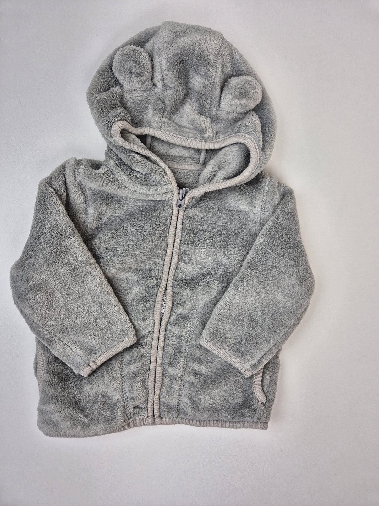 Měkoučká fleecová mikinka ve velikosti 68 v krásném světle šedém odstínu – ideální kousek do chladnějších dnů. Je vyrobená z opravdu hebkého fleecu, který krásně hřeje a je příjemný na dotek. Kapuce má roztomilá ouška, takže miminko v ní vypadá jako malý medvídek. Zapínání na zip usnadňuje oblékání a nechybí ani malé kapsičky. Skvělá do kočárku, na procházky i na doma jako hřejivá vrstva.