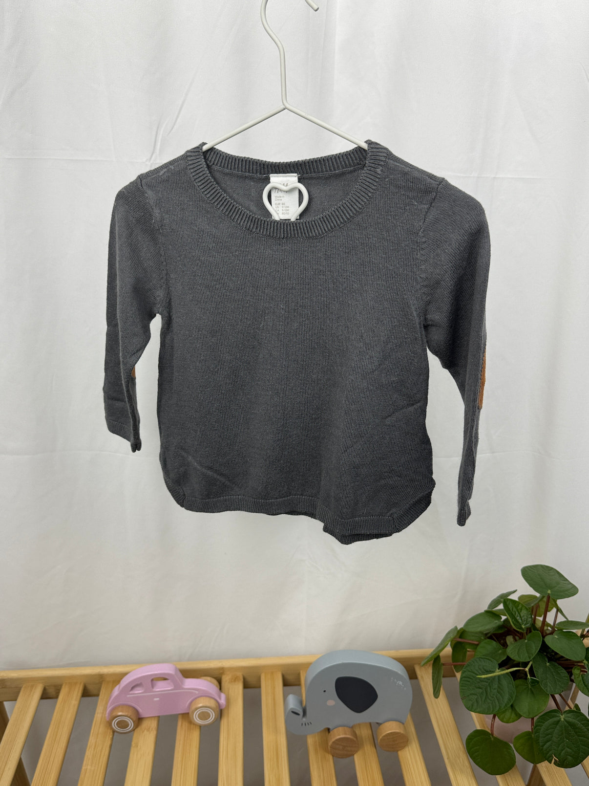 Tmavě šedý svetr od H&M ve velikosti 80 je ideální volbou pro chladnější dny. Tento kousek je vyroben z příjemného a měkkého materiálu, který poskytuje pohodlí po celý den. Na loktech najdeš kontrastní záplaty, které přidávají stylový detail a zároveň chrání látku před opotřebením.