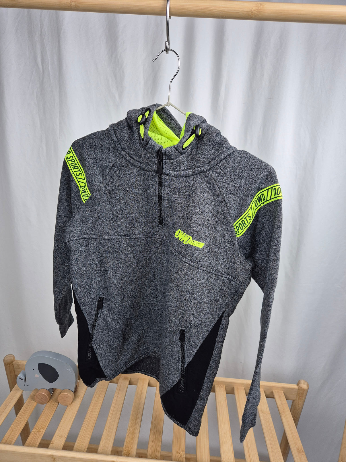 Sportovní mikina značky C&A v moderní tmavě šedé barvě s výraznými neonově žlutými detaily. Příjemný, pružný materiál zajišťuje pohodlí při pohybu, ideální na sport, tělocvik i volný čas. Mikina má praktickou kapuci, poloviční zip u krku a dvojité kapsy na zip po stranách. Stylové nápisy „SPORTS / DOWNLOAD“ dodávají mikině moderní vzhled, který si kluci určitě oblíbí.
