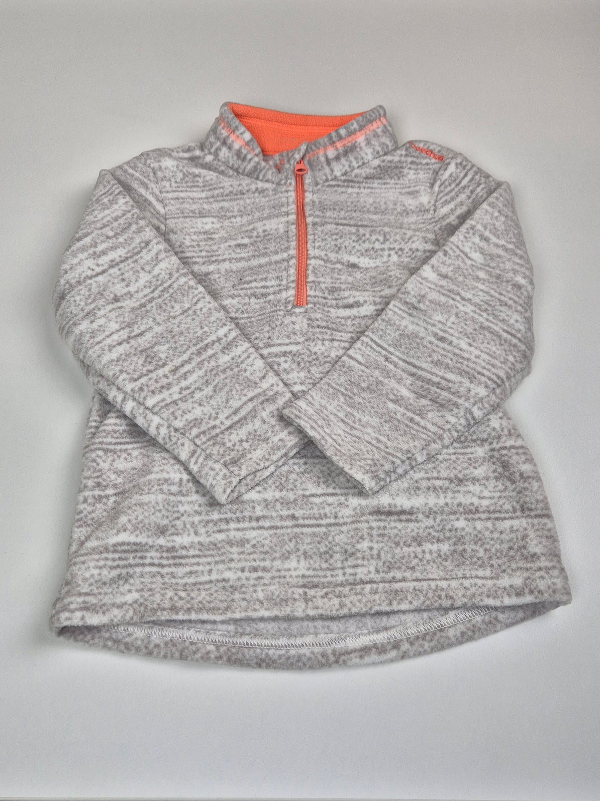 Měkoučká fleecová mikina Decathlon v odstínu světle šedé s jemným melírem, ideální na ven i na doma během chladnějších dnů. Stojáček s praktickým polovičním zipem v korálové barvě krásně oživuje celý kousek a usnadňuje oblékání. Hřejivý fleece je lehký, příjemný a skvělý na vrstvení – perfektní na procházky, do školky i na výlety.