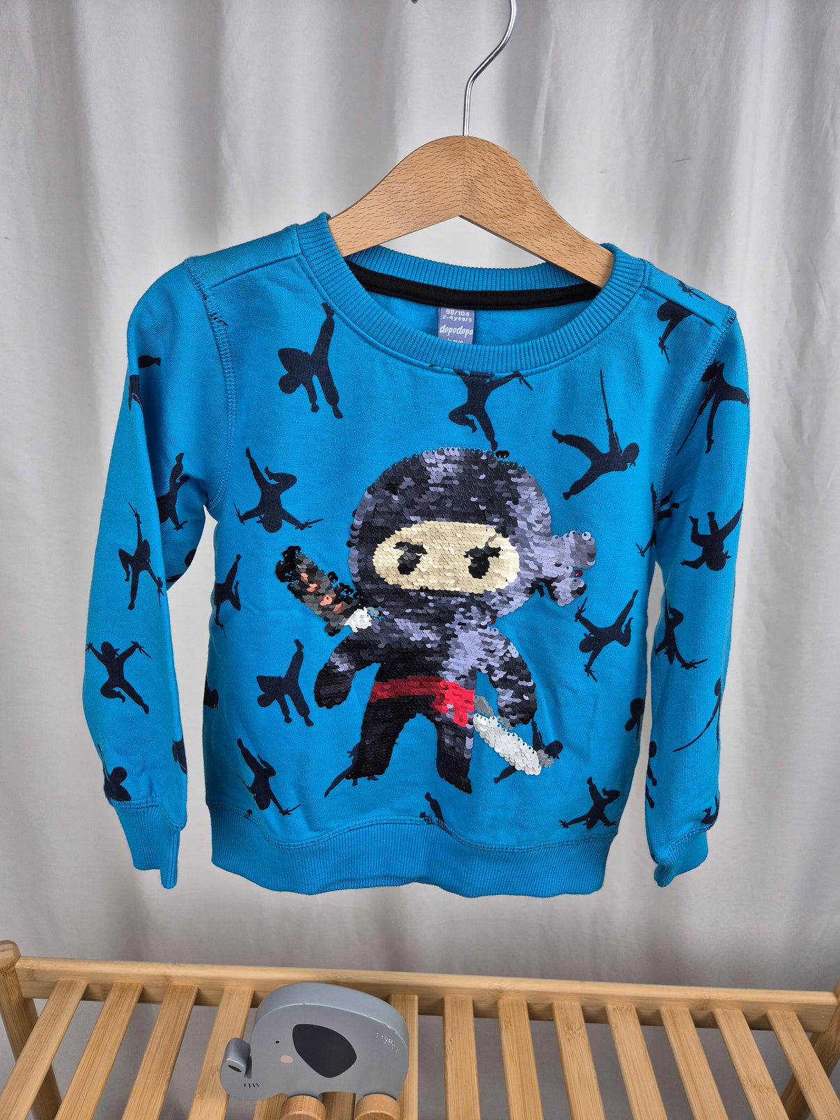 Stylová mikina Dopodopo v modré barvě s flitrovým motivem nindži potěší všechny malé akční hrdiny! Mikina má pohodlný střih, měkký úplet a pružné lemy, takže skvěle sedí a neomezuje v pohybu. Flitrový potisk mění barvu pohybem ruky – zaručený hit pro každého malého bojovníka.