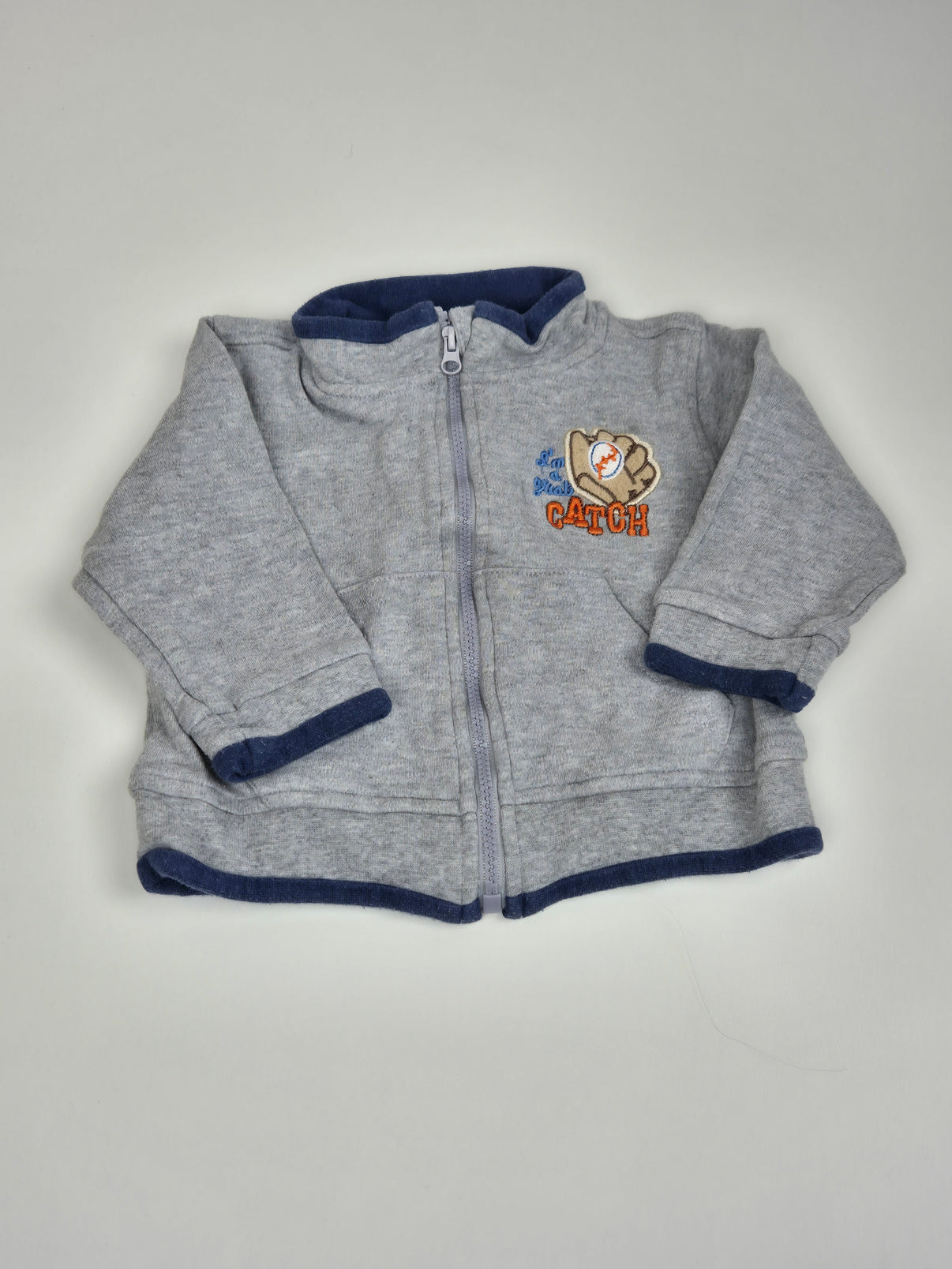 Pohodlná světle šedá mikinka Frog ve velikosti 68/74 je ideální na běžné nošení pro miminko. Má praktické zapínání na zip, které usnadňuje oblékání, a doplněná je tmavě modrými lemy pro hezký kontrast. Na přední straně ji zdobí výšivka baseballové rukavice s nápisem “Catch“, což dodává sportovní a hravý vzhled. Příjemný měkký materiál zajišťuje pohodlí po celý den.