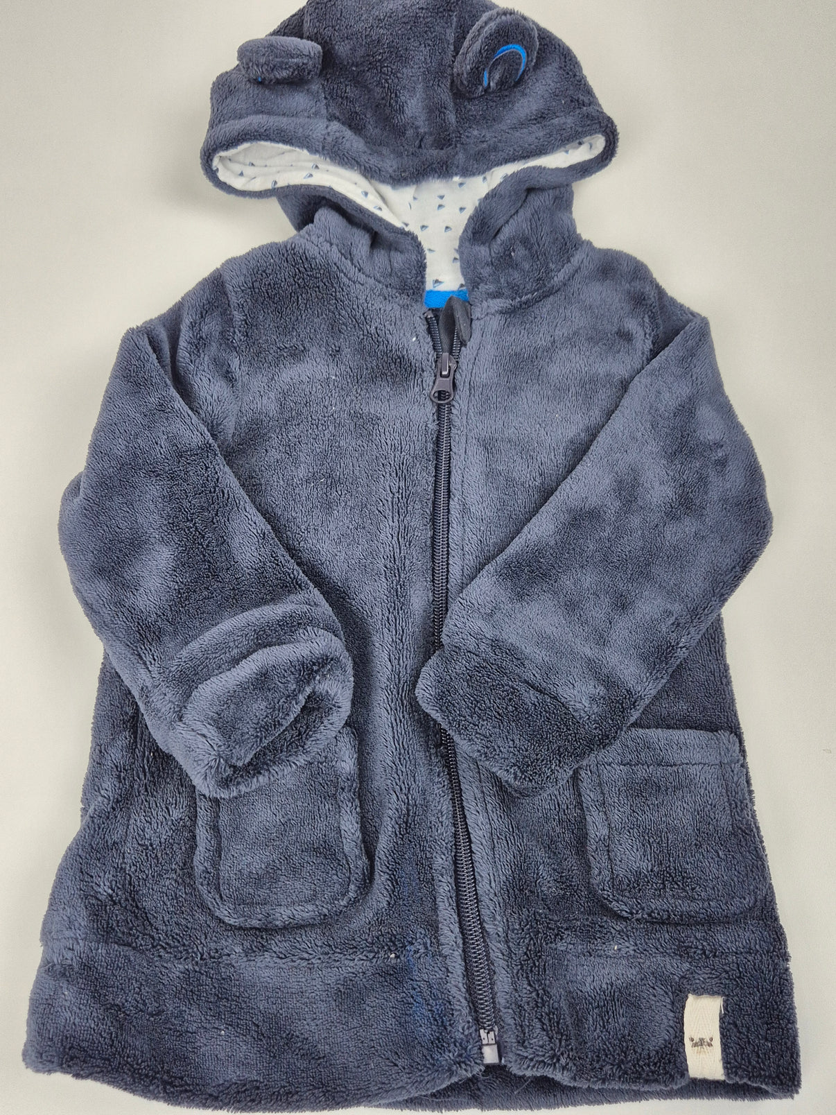 Hebká chlupatá mikina značky Kuniboo ve velikosti 86/92, v tmavě modrém odstínu. Uvnitř je podšitá jemnou látkou se vzorem, kapuce je ozdobená oušky a vpředu nechybí praktické kapsy. Zapínání na zip usnadňuje oblékání. Skvělý kousek, který zahřeje v chladnějších dnech.