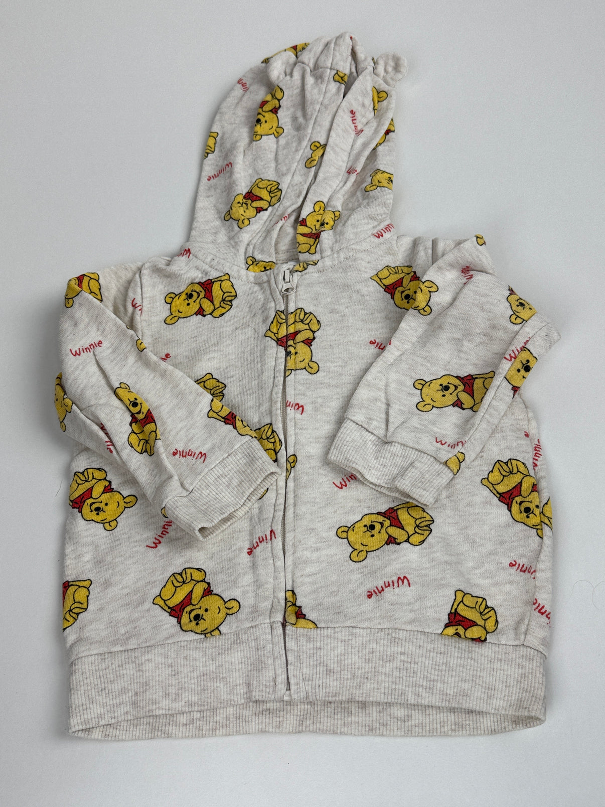 Dívčí/klučičí mikina značky H&M ve velikosti 74 s motivem Medvídka Pú. Světle šedý základ doplňují veselé potisky oblíbené pohádkové postavičky v žluté a červené barvě. Mikina má kapuci s oušky, zapínání na zip a pružné lemy na rukávech i spodním okraji.