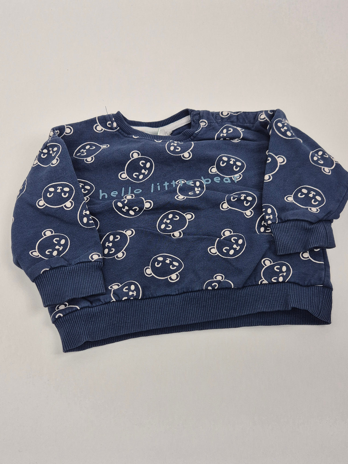 Pohodlná tmavě modrá mikina s roztomilým potiskem medvídků a nápisem hello little bear. Příjemný bavlněný materiál je ideální do školky i na venkovní hraní. Žebrované lemy na rukávech a spodním okraji krásně drží tvar a zajišťují pohodlí při nošení.