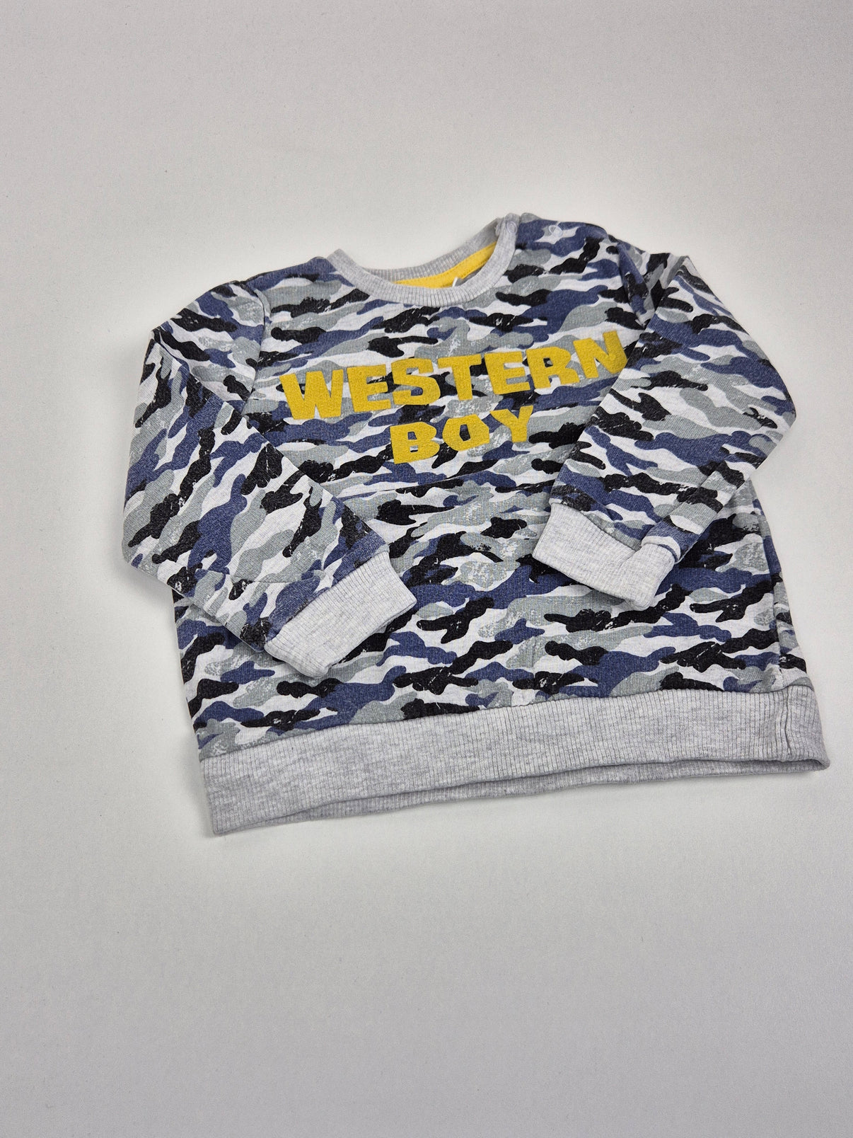 Mikina Pepco ve velikosti 80 – stylová chlapecká mikina s moderním maskáčovým vzorem v odstínech modré, šedé a černé. Na přední straně má výrazný žlutý nápis WESTERN BOY, který dodává mikině cool vzhled. Spodní lem, lem u krku i manžety jsou žebrované a světle šedé, což zajišťuje pohodlné nošení a dobré držení tvaru.