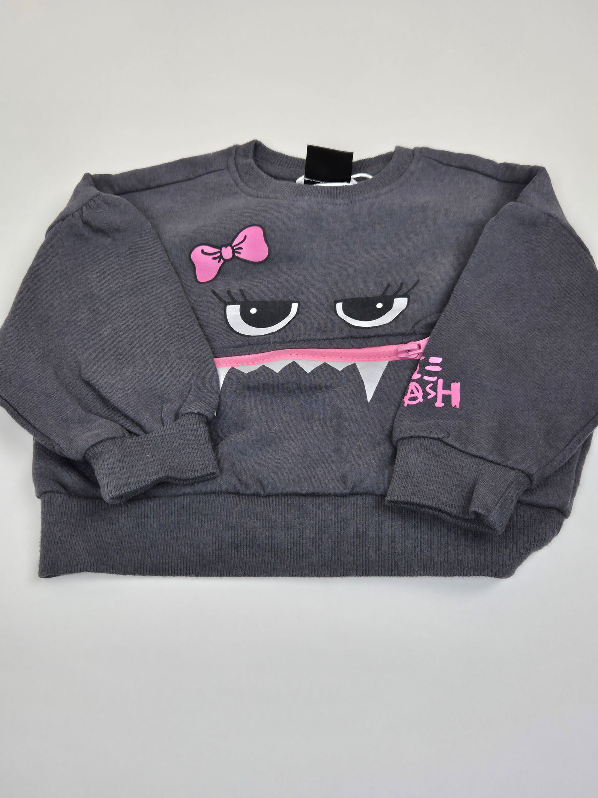 Tmavě šedá mikina s roztomilým „monster“ motivem, která si získá každou malou parádnici. Oči s dlouhými řasami, růžová mašlička a detailní potisk zoubků dodávají mikině hravý výraz. Příjemná bavlněná teplákovina se dobře nosí, žebrované manžety a spodní lem pěkně drží tvar. Skvělá volba na školku, hřiště i každodenní dobrodružství.