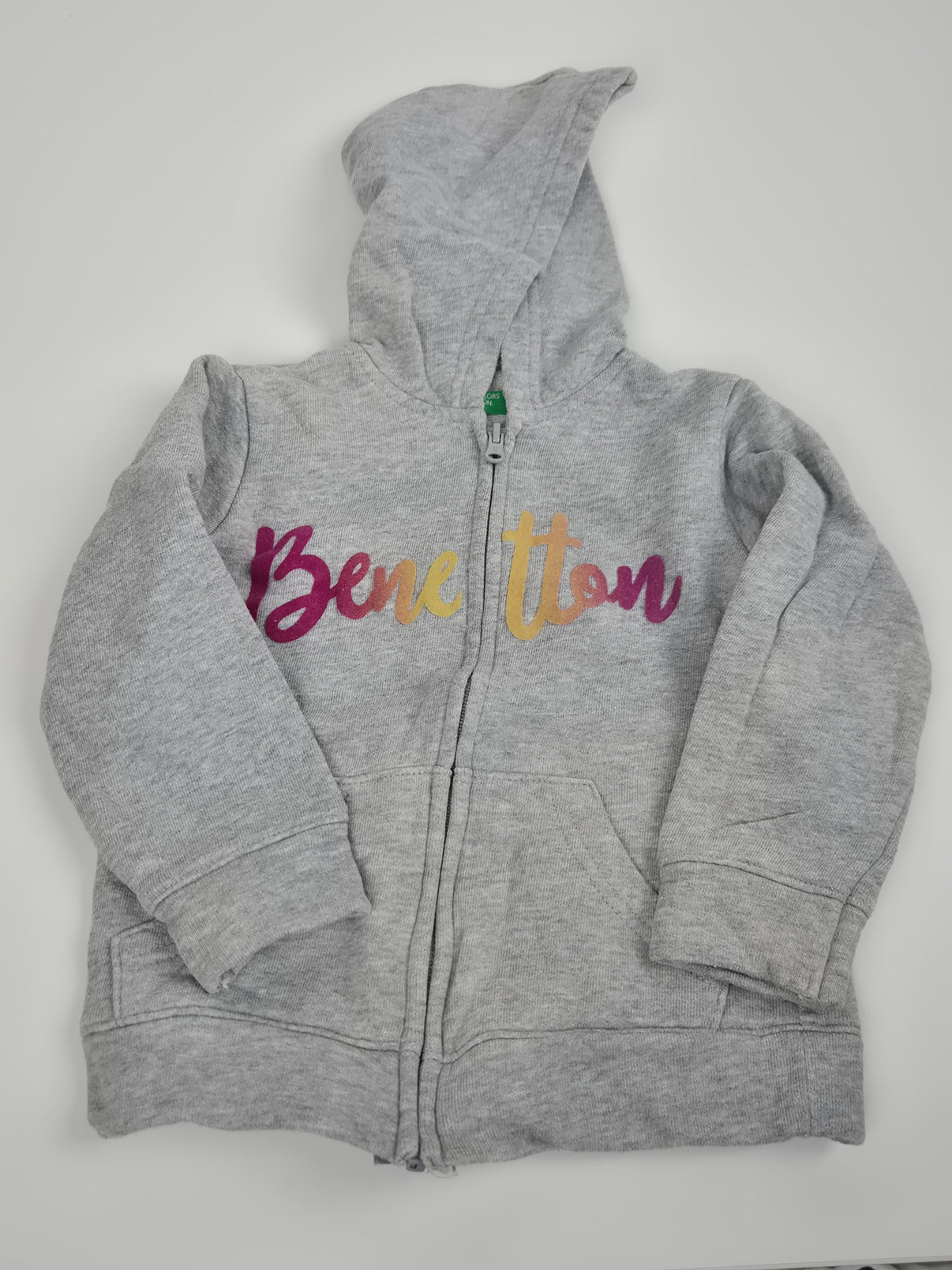 Mikina značky United Colors of Benetton ve velikosti 100. V šedé barvě, s kapucí a zapínáním na zip. Na přední straně výrazný barevný nápis „Benetton“. Praktický kousek na každodenní nošení, určený spíše pro holčičky.