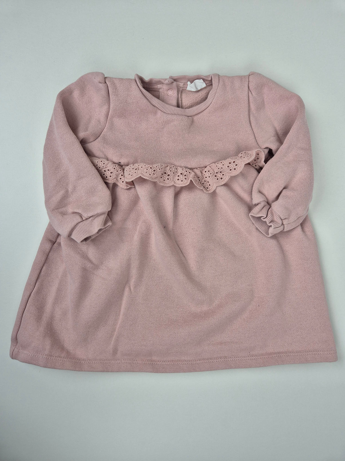 Světle růžové mikinošaty F&F ve velikosti 86 s dlouhým rukávem. V pase je zdobí roztomilý volánek s krajkovým vzorem, který jim dodává jemný holčičí šmrnc. Pohodlný a měkký materiál je ideální na běžné nošení do školky i na slavnostnější příležitosti.