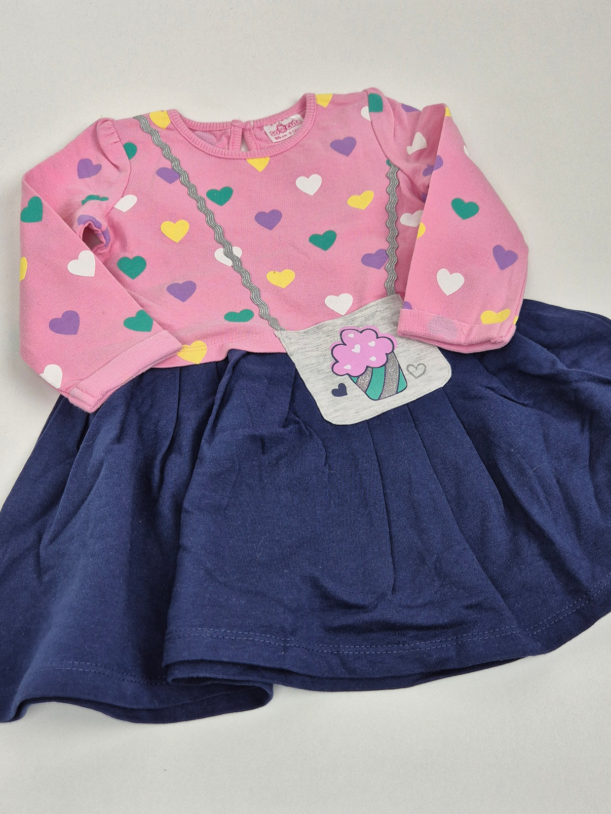 Roztomilé mikinošaty s dlouhým rukávem v kombinaci růžového vršku s barevnými srdíčky a tmavě modré sukně. Lehký měkký materiál je ideální na každodenní nošení do školky i na ven. Hravý detail v podobě potisku kabelky na rameni dodává šatičkám veselý a originální vzhled. Skvělé pro malou holčičku, která miluje barevné a pohodlné kousky.