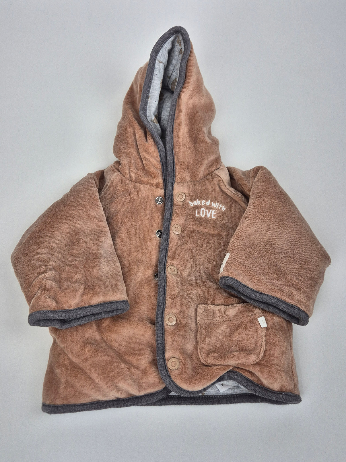 Oboustranná mikina Feetje ve velikosti 68. Jedna strana plyšová hnědá s kapsičkou a výšivkou, druhá strana bavlněná šedá s potiskem croissantů. Pohodlná, hřejivá a praktická – dvě mikiny v jedné!