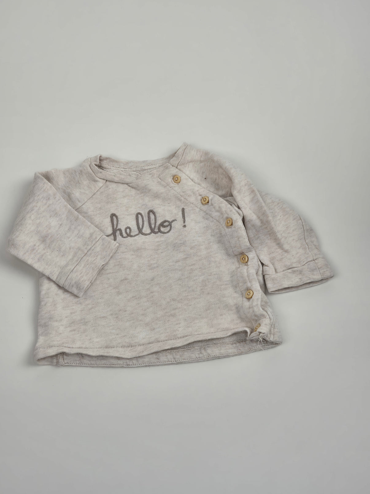 Pohodlný set pro ty nejmenší na každodenní nošení. Béžová mikinka se zapínáním na dřevěné knoflíčky na boku a nápisem "hello!" je nejen praktická, ale i roztomilá. Tepláčky ve stejném odstínu...