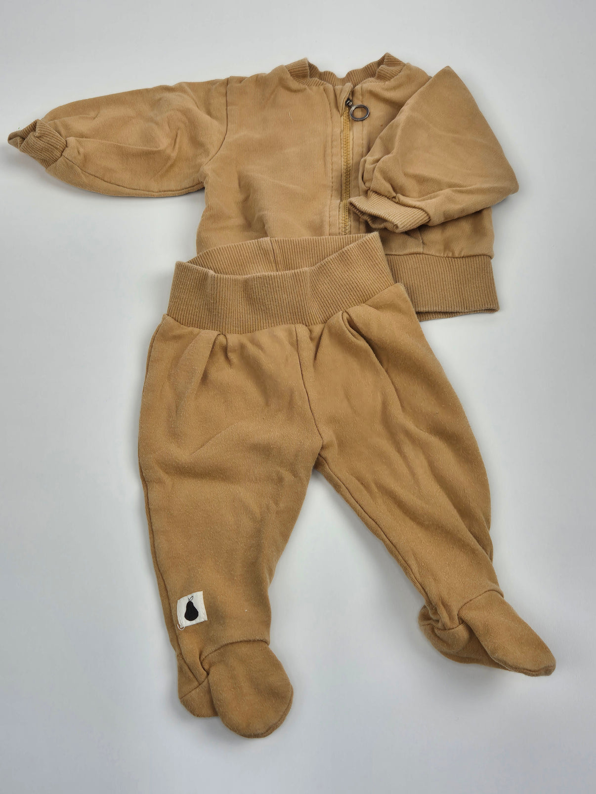 Karamelově hnědý set značky Pinokio ve velikosti 62 je roztomilou volbou pro nejmenší miminka. Měkoučká mikina se zapínáním na zip má na zádech originální potisk hruštičky a nápis „belle journée“, který dodává celému outfitu francouzský šmrnc. Polodupačky ve stejném odstínu doplňuje drobný štítek s hruškou na nohavičce. Celý komplet je vyrobený z příjemného materiálu a ideální na nošení doma, do kočárku i na návštěvy. Neutrální design vhodný pro holčičky i chlapečky.