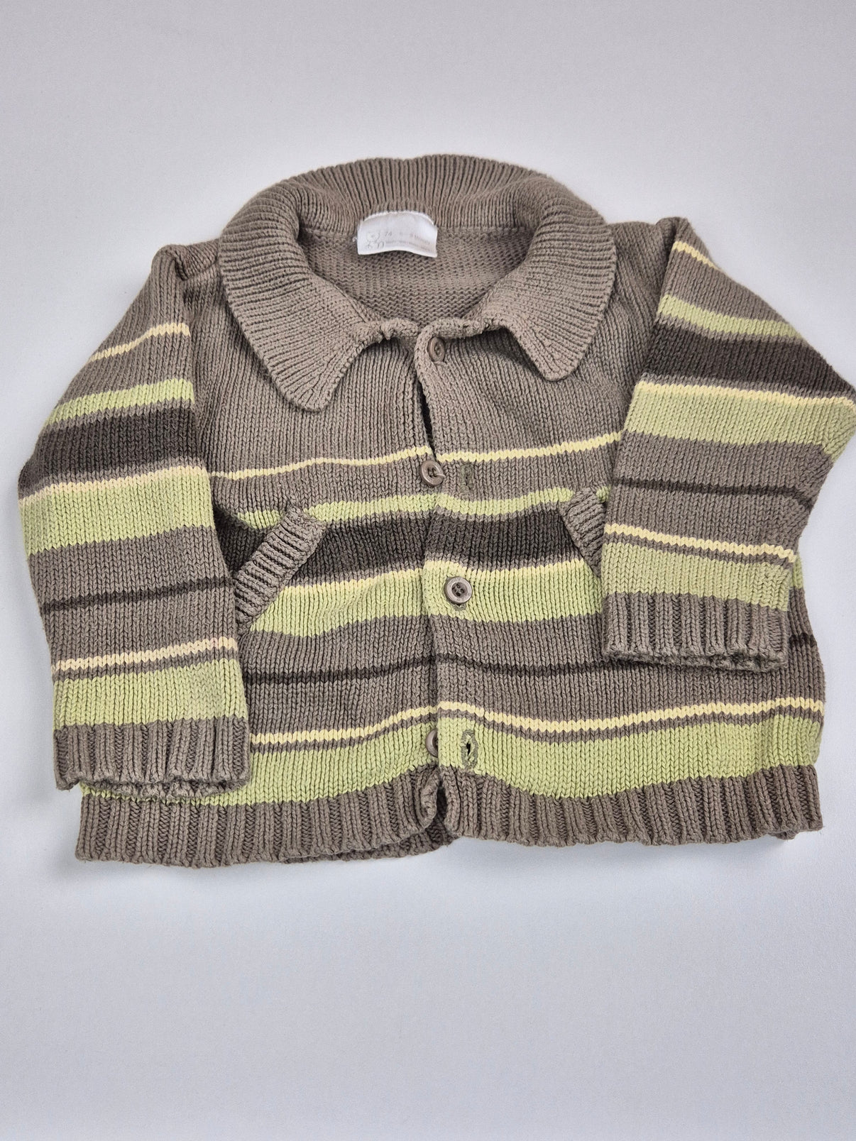 Příjemný pletený svetr ve velikosti 74 v jemných přírodních tónech. Kombinace béžové, hnědé a světle zelené vytváří krásný, klidný vzhled, který se skvěle hodí pro malé kluky i holčičky. Svetr má klasický límeček, zapínání na knoflíčky po celé délce a dvě malé kapsičky vpředu. Měkký úplet je ideální na chladnější dny – do kočárku, do školky i na běžné nošení.