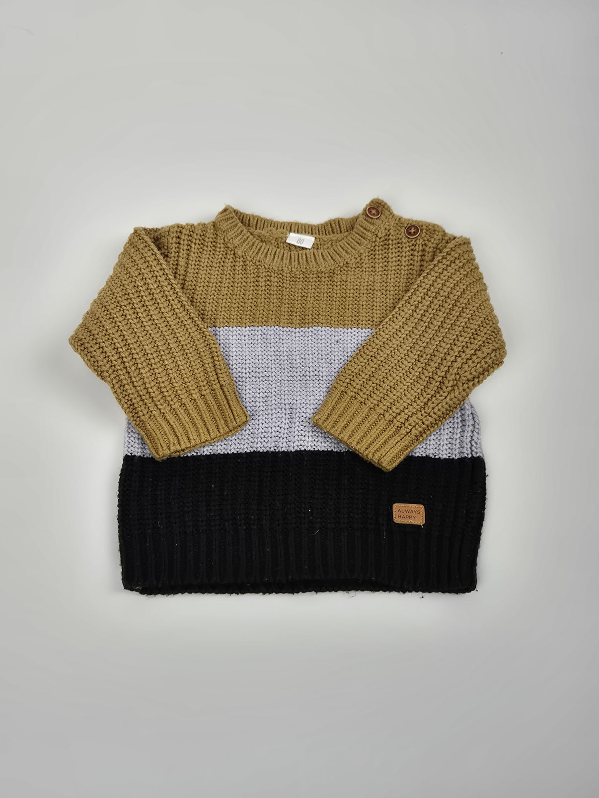 Pohodlný pletený svetr v trojbarevném provedení je skvělým kouskem pro chladnější dny. Kombinace hořčicově žluté, světle šedé a černé barvy působí stylově. Díky knoflíčkům na rameni se snadno obléká a příjemný materiál zajistí pohodlí po celý den. Ideální do školky, na procházky i do města. Na spodním lemu najdeš decentní nášivku s nápisem „Always Happy“.